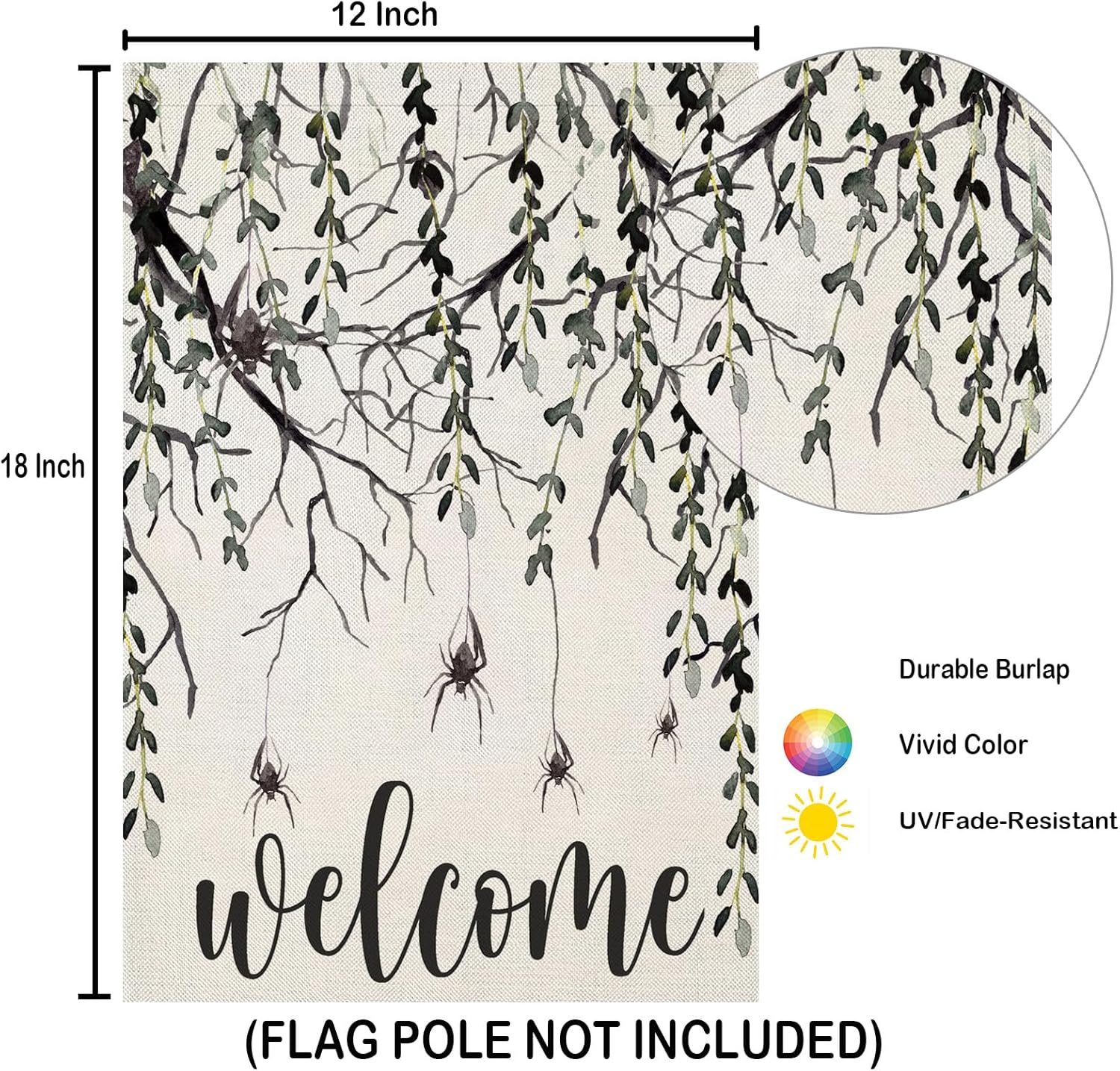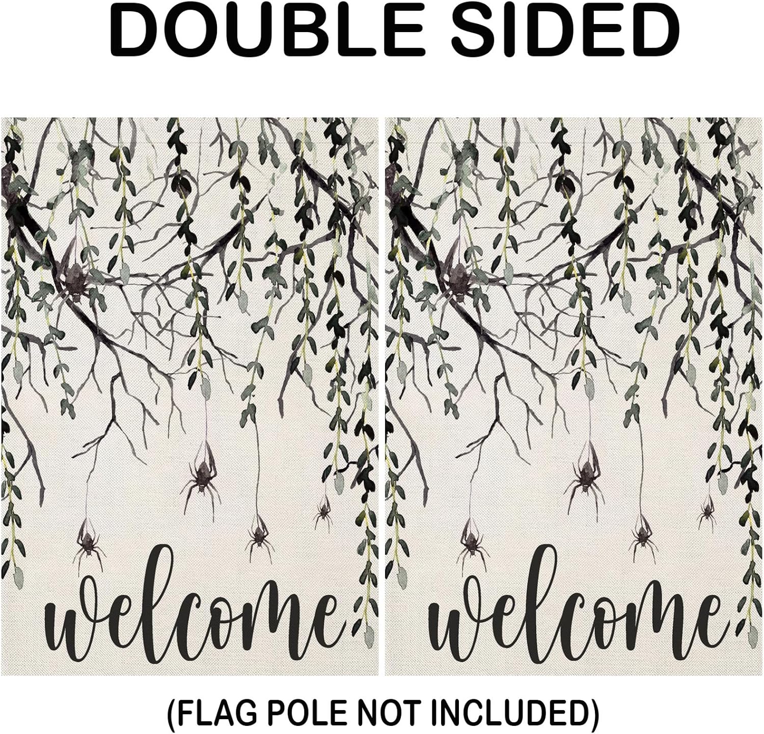Enhance your outdoor Halloween decor with this Halloween Welcome Sign Garden Flag, featuring a hauntingly beautiful design of cascading branches with hanging spiders. This eerie yet elegant flag is the great way to greet guests while adding a festive and mysterious touch to your home. Made from high-quality burlap fabric, it withstands outdoor elements, maintaining its vivid colors and eerie charm throughout the season. Whether you display it in your garden, porch, or yard, this flag is a must-have for any Halloween enthusiast.