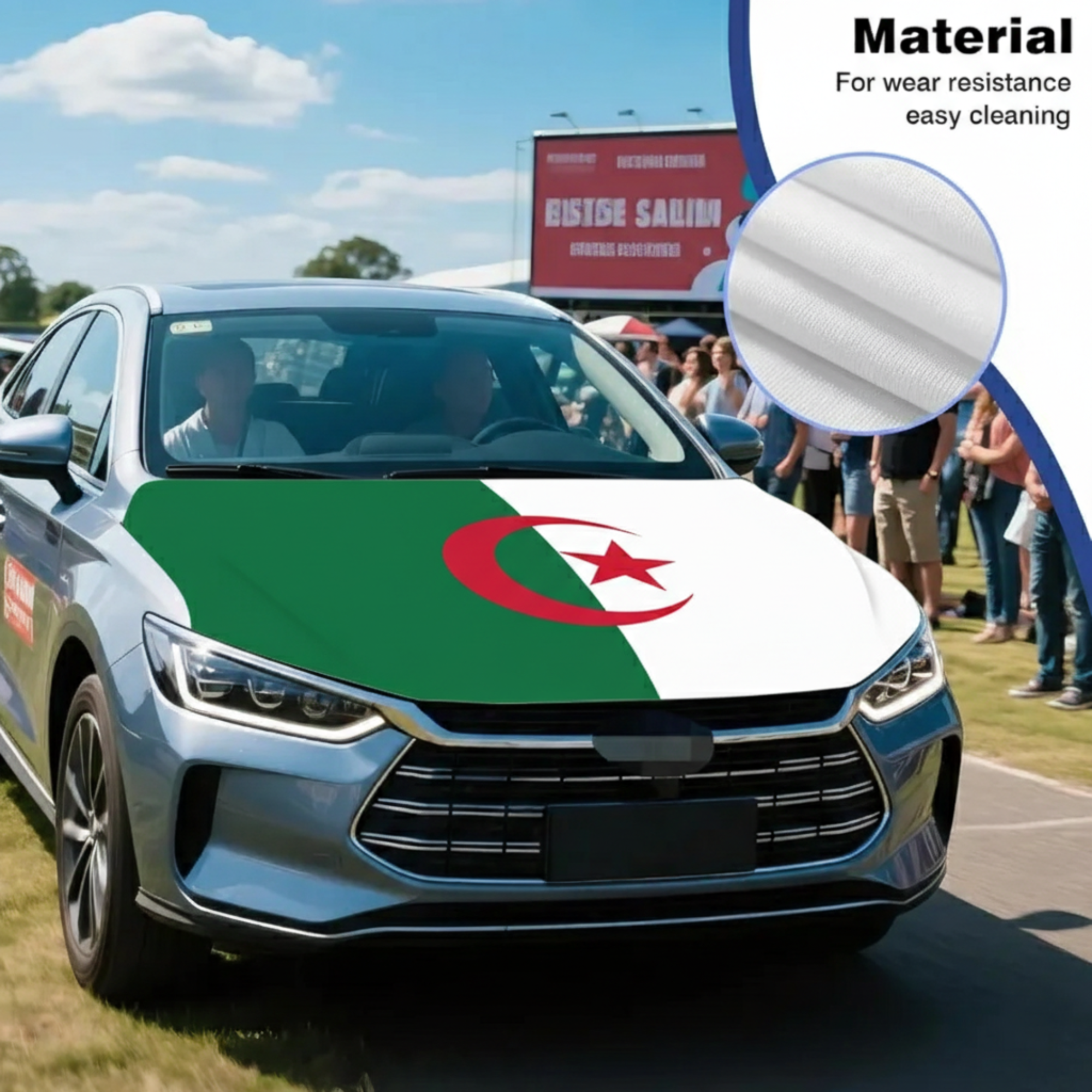 Made from stretch polyester fabric, the material fits closely across the hood area and maintains a smooth appearance during normal driving conditions. The Algeria flag design provides a clear national display suitable for parades, sporting events, cultural gatherings, and everyday vehicle decoration.