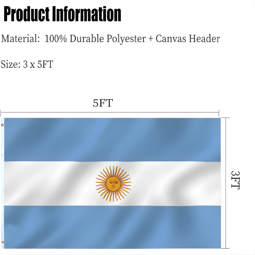 This 3x5 outdoor Official FIFA 2026 Argentina Flag is designed for display across a wide range of environments, presenting a clear symbol of national pride. Manufactured using three layer 200D polyester fabric, the double sided structure allows the light blue and white stripes with the Sun of May emblem to appear properly on both sides instead of showing a mirrored reverse image. A reinforced canvas style header improves overall support and allows convenient hanging, making the flag appropriate for gardens, patios, marine areas, public spaces, and interior decoration. Fade resistant printing helps maintain the distinctive colors and central emblem over extended periods of use, while reinforced edge stitching assists in maintaining the structure during outdoor display. The lightweight material moves smoothly even in mild wind conditions, creating a balanced presentation during football tournaments, cultural gatherings, or everyday decoration. This overview provides key product details to assist customers when reviewing specifications before choosing the item.