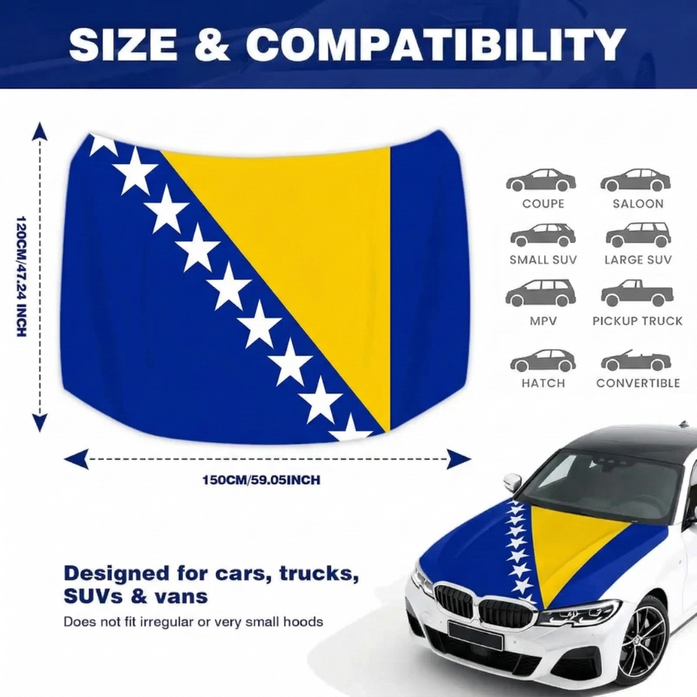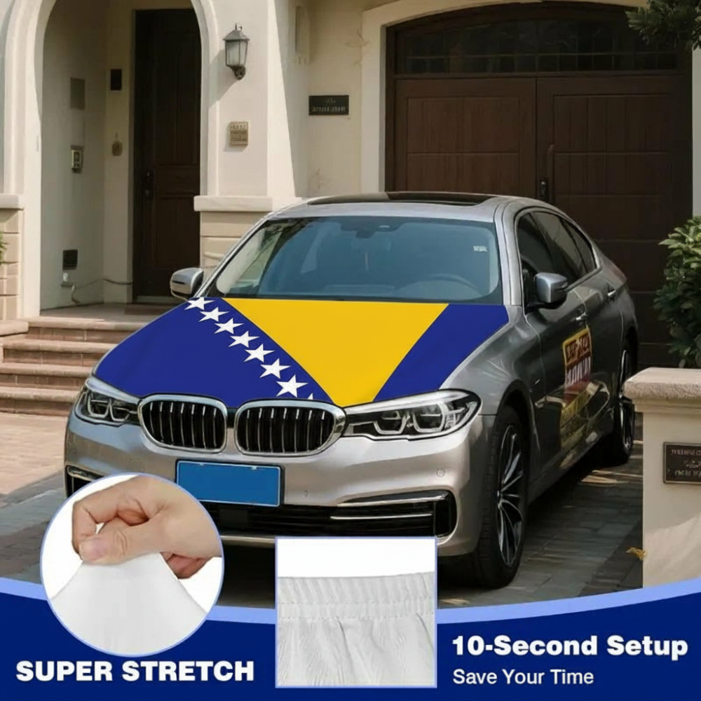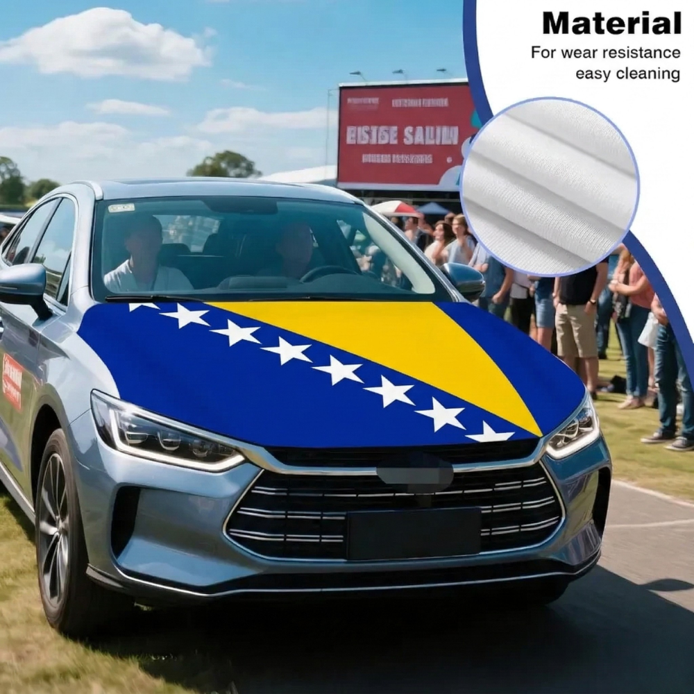 Constructed from stretch polyester fabric, the material fits closely over the hood area and maintains a smooth visual appearance during regular driving conditions. The Bosnia and Herzegovina flag design adds a clear national display suitable for parades, sporting events, cultural gatherings, and everyday vehicle decoration.