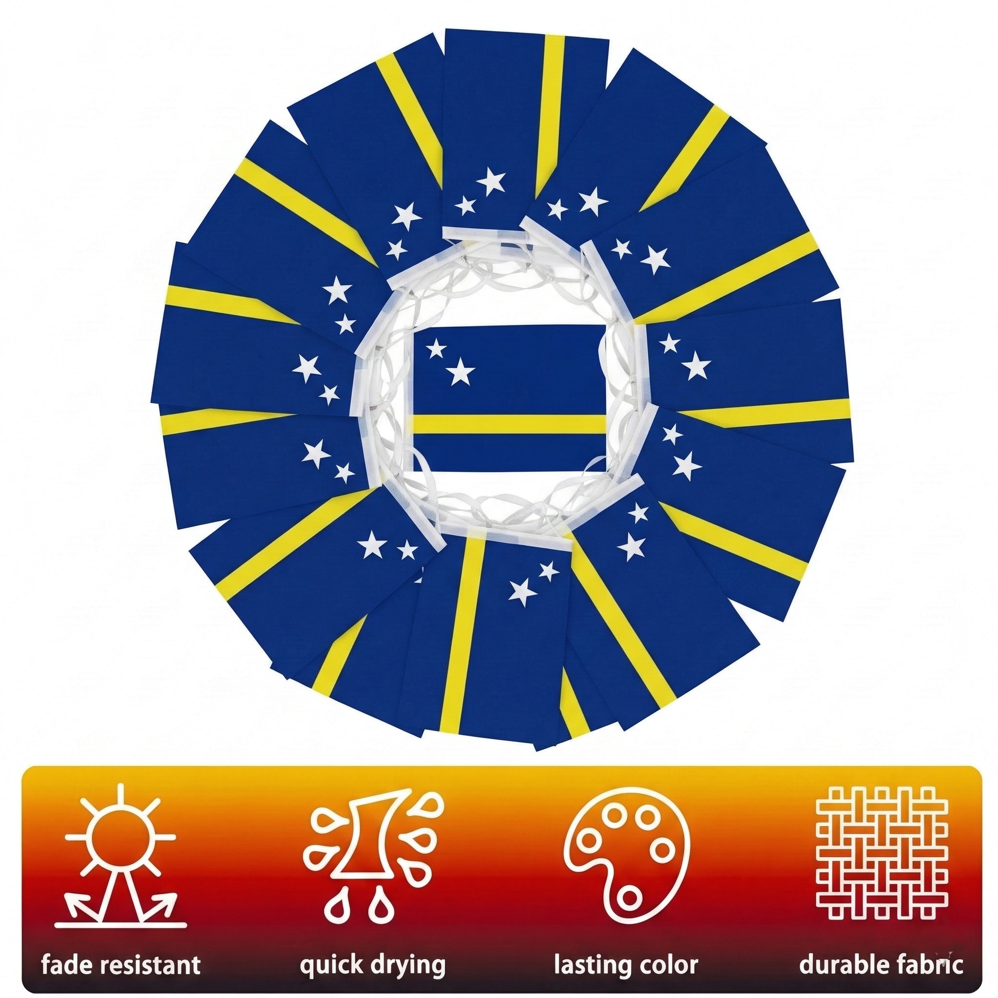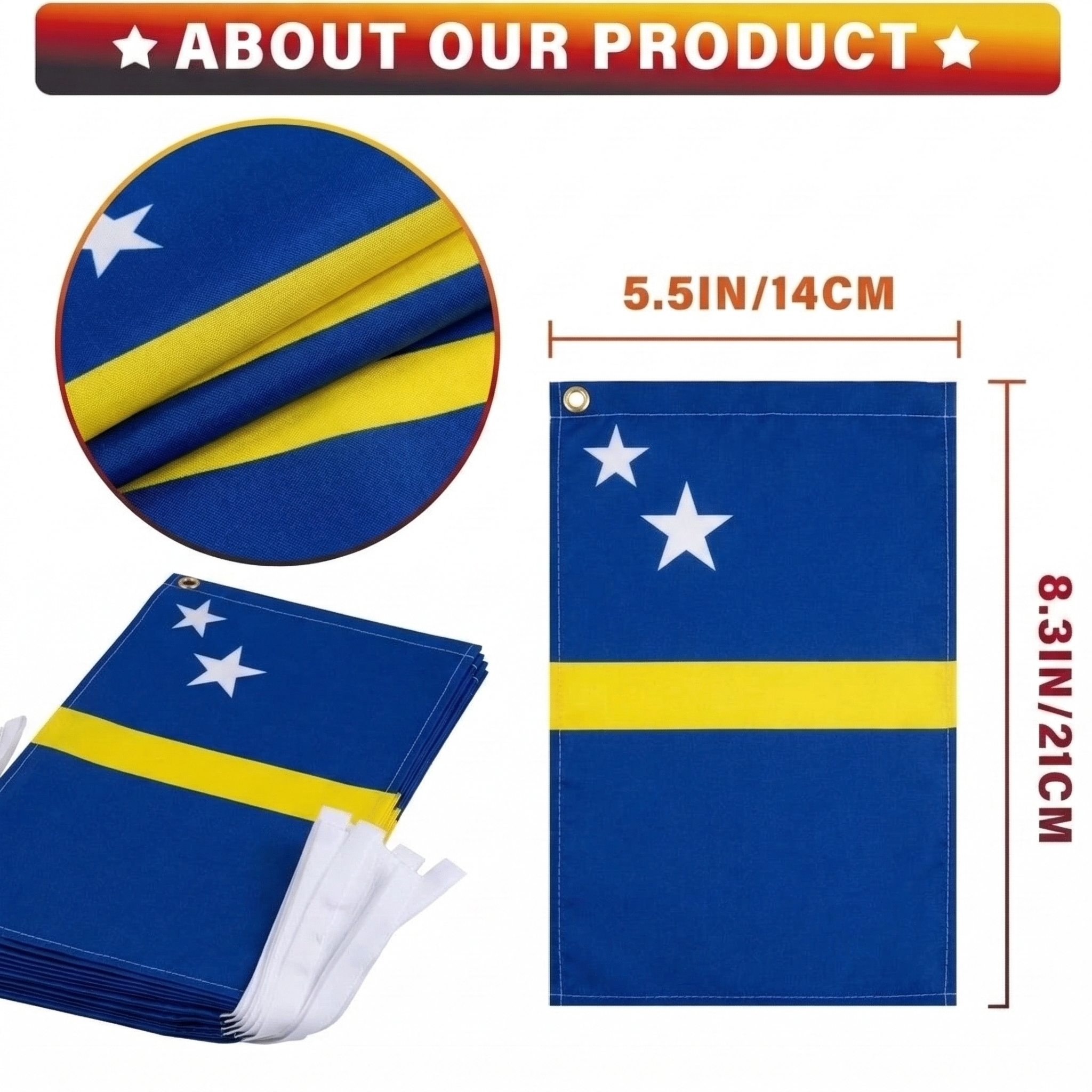 This Official FIFA 2026 Curaçao Flag Banner is designed to create a festive and patriotic atmosphere for schools, parties, sporting events, and national celebrations. Measuring approximately 33 feet in total length, the string includes 30 small Curaçao flags, each sized about 5.5 x 8.2 inches. The bold blue design with yellow stripe and white stars adds visual impact to classrooms, offices, porches, balconies, gardens, and sports venues. Carefully stitched edges and clean finishing details enhance presentation and overall appearance. Lightweight and foldable, the banner is easy to hang, remove, and store for future events.
