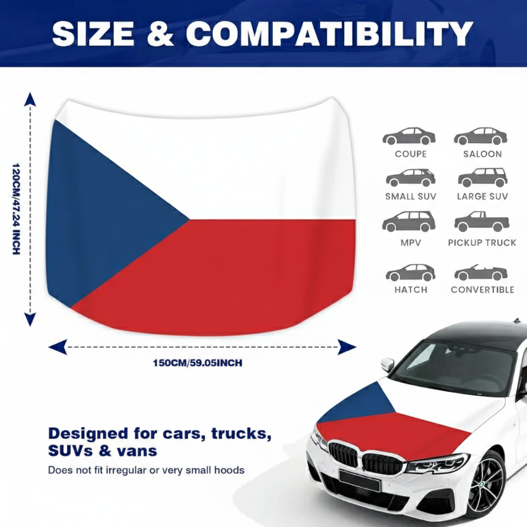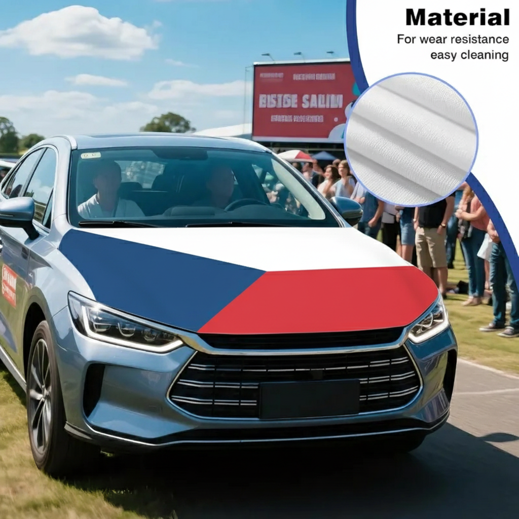 This Official FIFA 2026 Czech Republic Flag Car Hood Cover is created to give vehicles a strong patriotic appearance while providing practical hood coverage during daily driving or special occasions. Measuring approximately 4 x 5 feet, the cover offers a universal fit compatible with most cars, trucks, and SUVs. The stretch polyester fabric allows the material to adapt smoothly across the hood surface while maintaining a neat appearance during normal vehicle use. The printed Czech Republic flag design displays national colors clearly across the hood, making it suitable for football tournaments, national holidays, parades, and public celebrations. The flexible fabric design supports quick placement and removal, allowing drivers to decorate their vehicles conveniently when needed. Its construction also supports use in common outdoor conditions such as sun, wind, and light rain, making it suitable for both short trips and event displays.