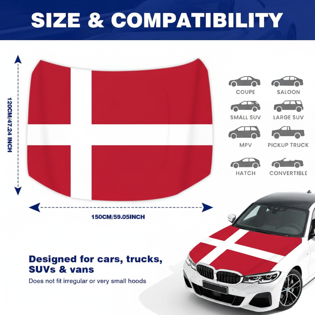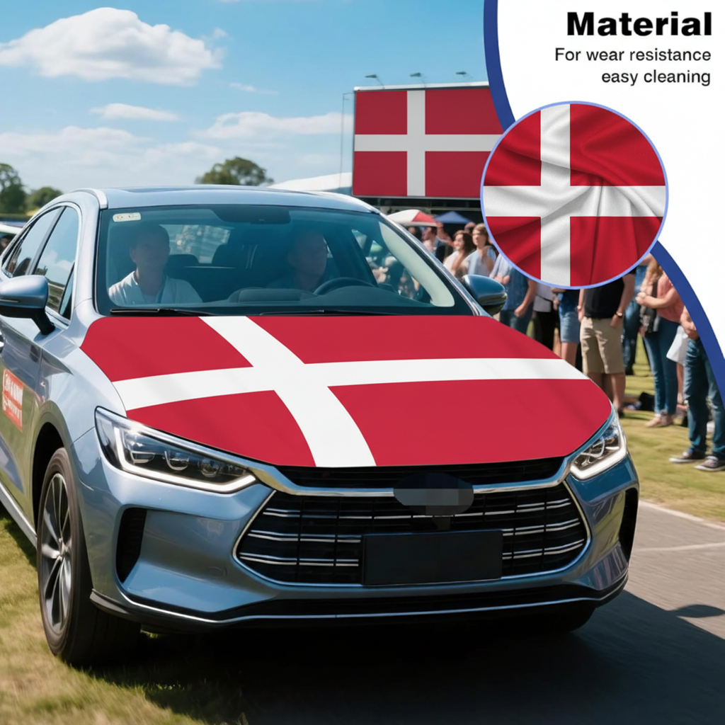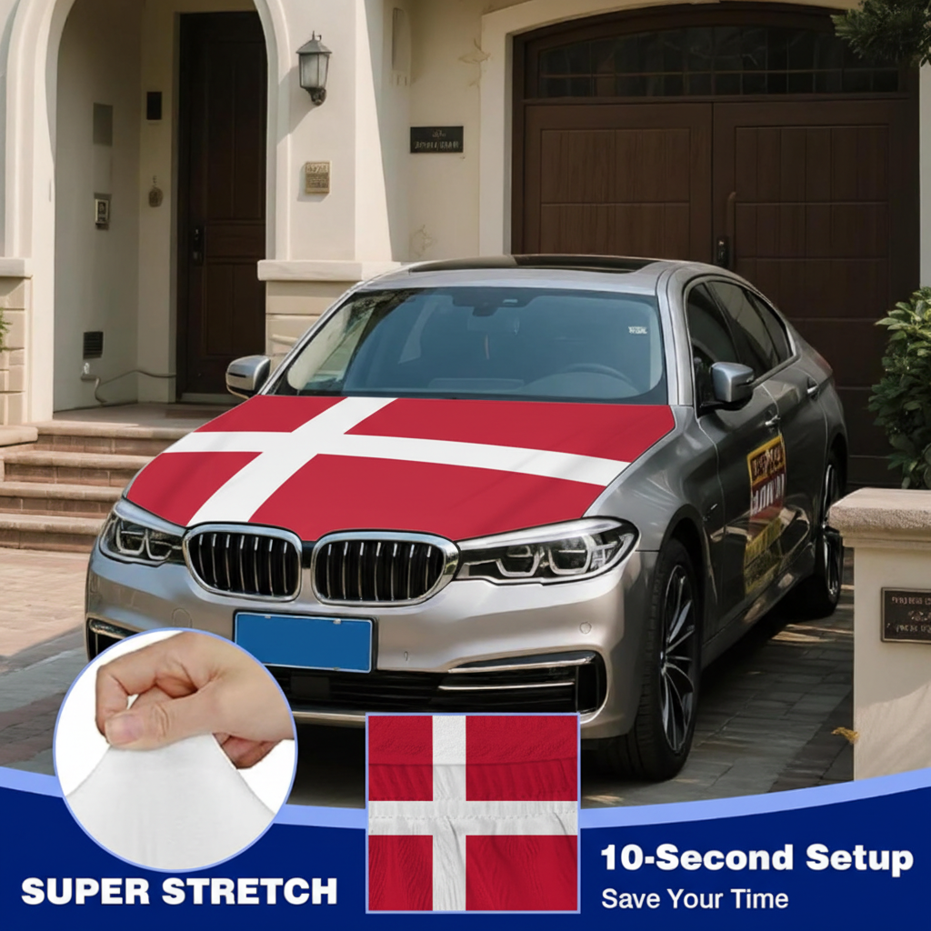 The Denmark flag design presents the traditional red background with the white Nordic cross, making it suitable for football tournaments, parades, national celebrations, and fan gatherings. The flexible fabric structure helps the cover remain positioned during normal driving conditions. Installation can be completed quickly without complicated steps, and the cover can be removed just as easily when not needed. This hood cover provides a simple way to decorate vehicles while supporting outdoor use in changing weather conditions.