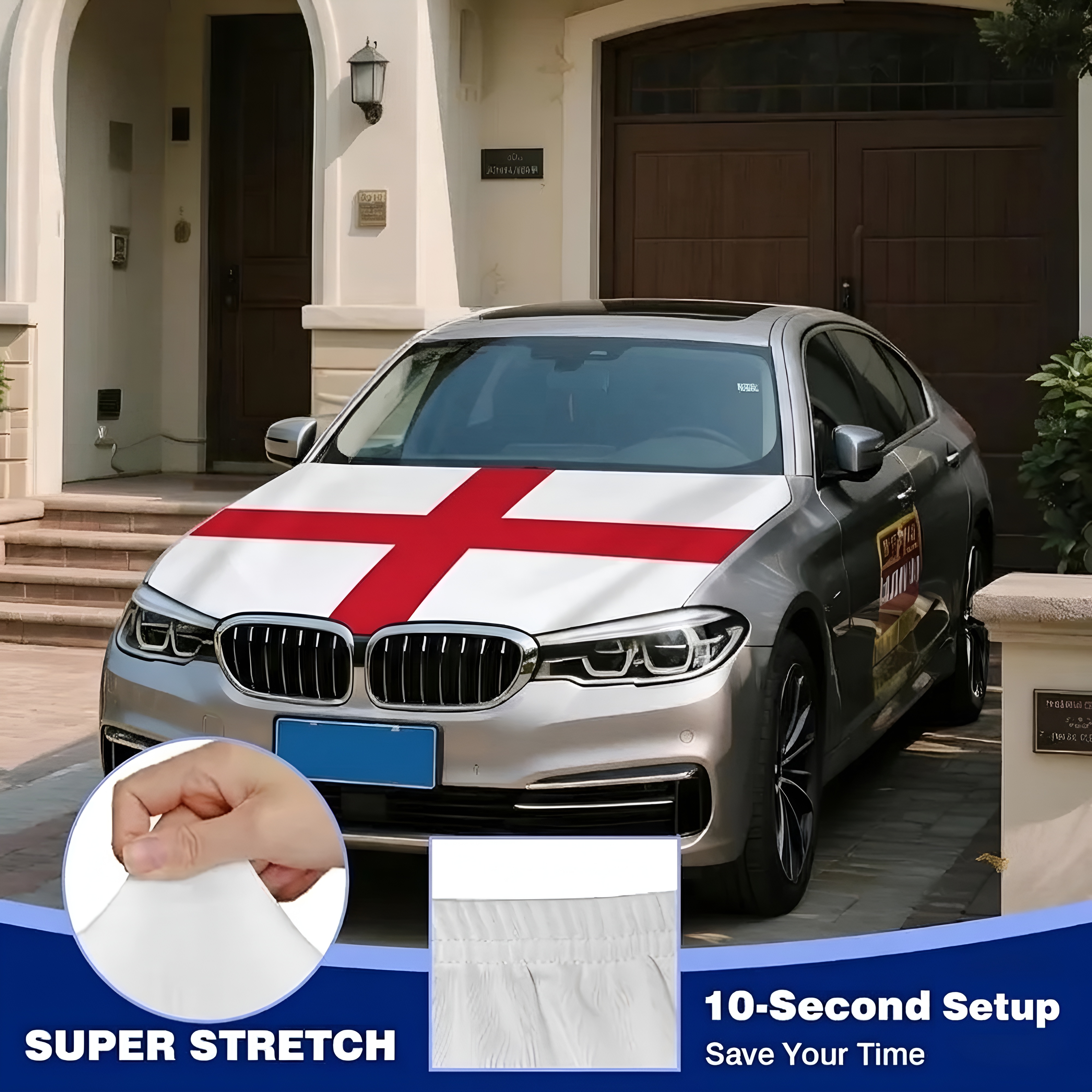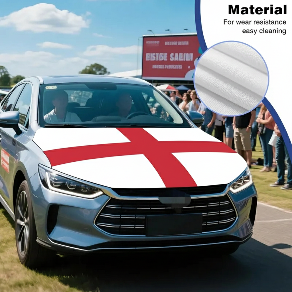 This Official FIFA 2026 England Flag Car Hood Cover is created to give vehicles a patriotic look while covering the hood area during everyday driving or special occasions. Measuring approximately 4 x 5 feet, the size allows compatibility with many standard cars, trucks, and SUVs. The cover is made from stretch polyester fabric that spreads evenly across the hood surface, helping create a smooth and balanced appearance once installed.