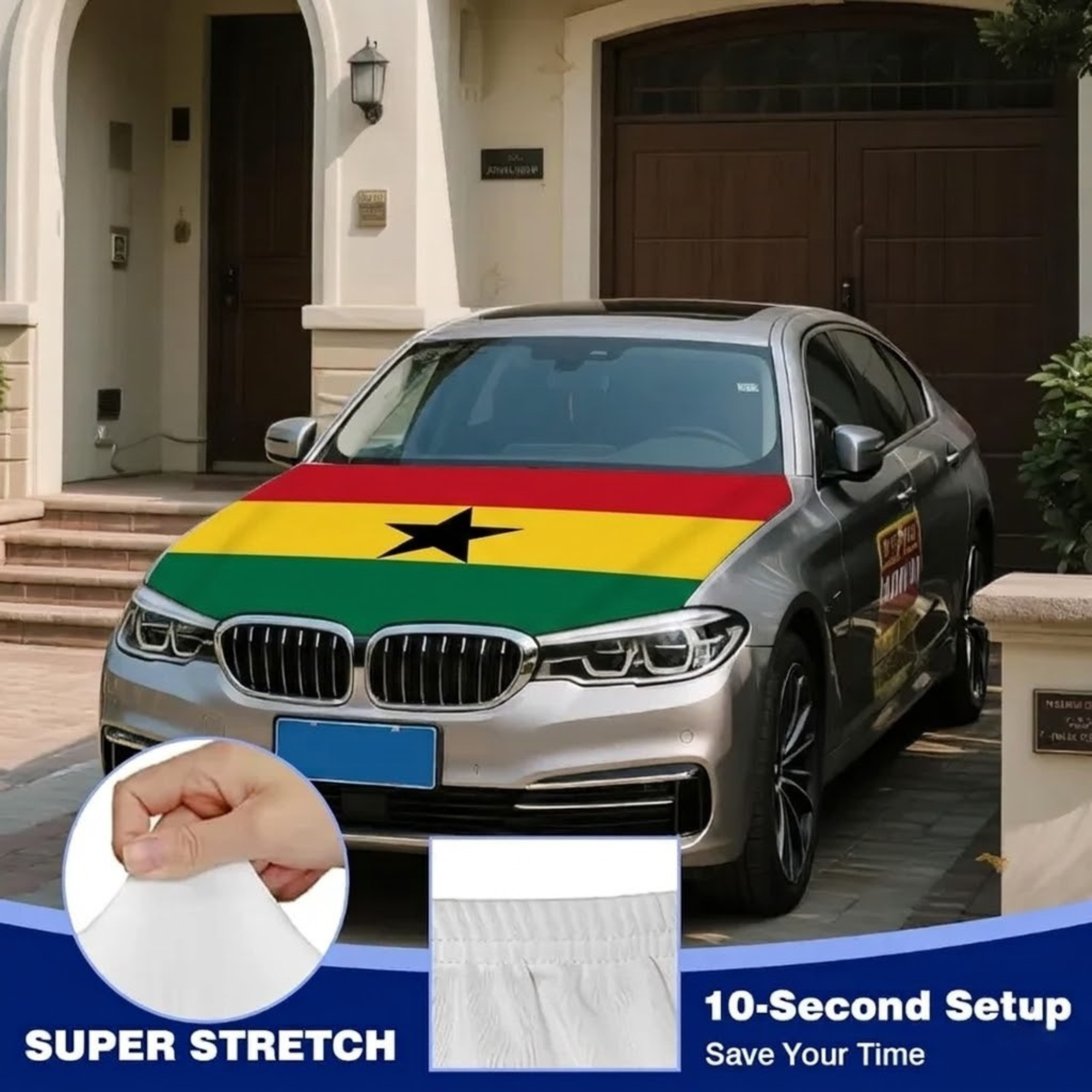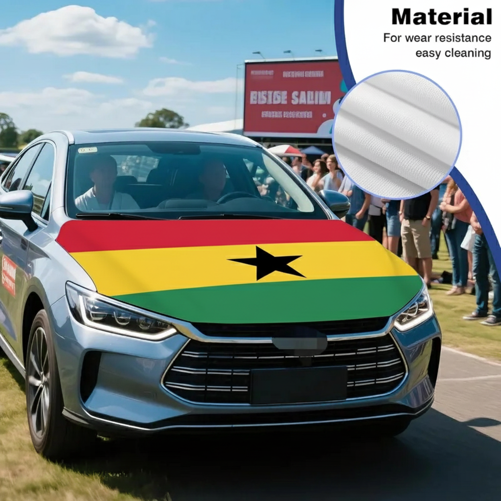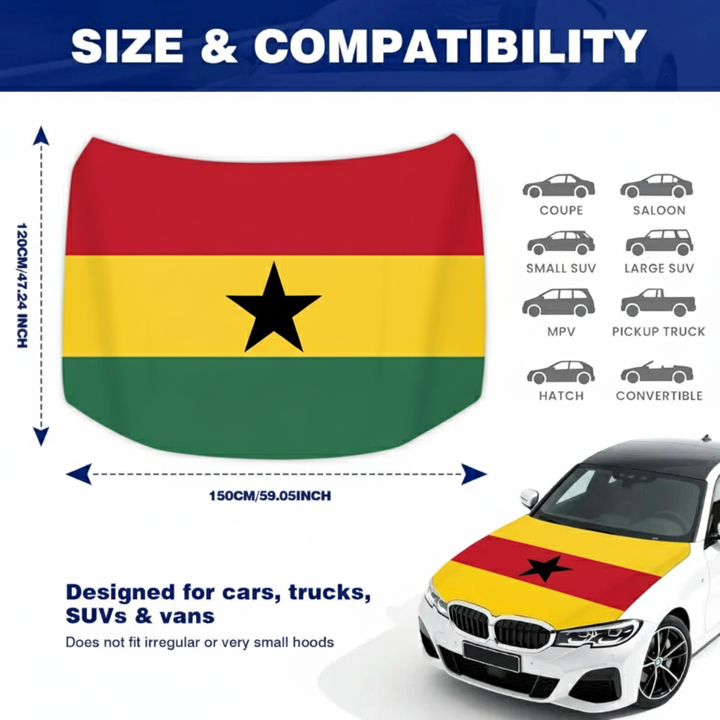 This Official FIFA 2026 Ghana Flag Car Hood Cover is designed to add a bold national display while providing practical surface coverage for everyday driving. Measuring approximately face coverage for e4 × 5 feet, it offers a universal fit suitable for most cars, trucks, and SUVs. Made from stretchable polyester fabric, the material fits smoothly across the hood area and maintains a neat appearance during regular use. The Ghana flag design features the recognizable red, yellow, and green colors with the central black star, creating a noticeable visual display for sporting events, parades, and national celebrations. The flexible fabric structure allows quick placement and removal, making it convenient for temporary or repeated use. Designed for outdoor conditions, the material helps maintain its appearance during sun, wind, and light rain exposure while supporting reliable everyday vehicle display.