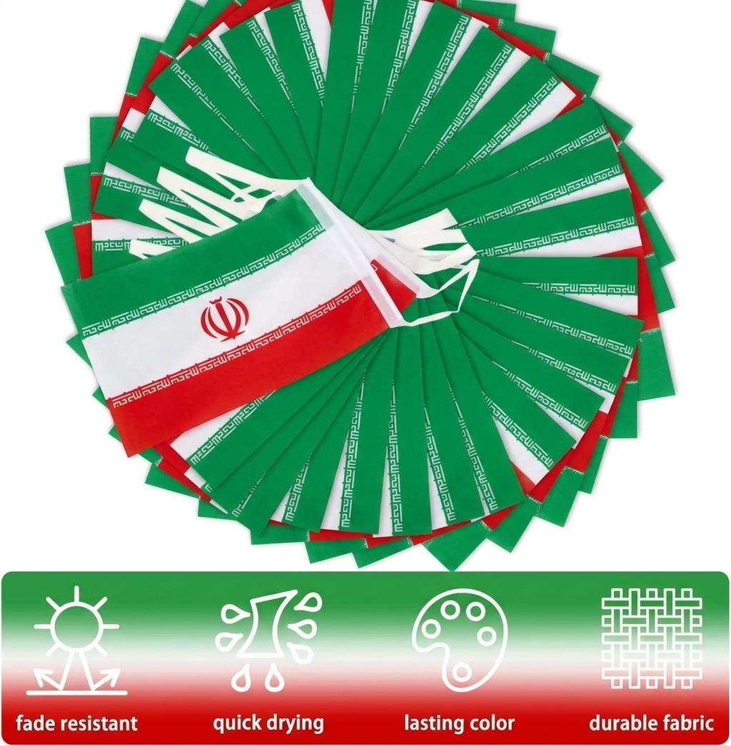This Official FIFA 2026 Iran Flag Banner is prepared to create a decorative display for schools, parties, sporting events, and national celebrations. Measuring approximately 33 feet in total length, the string includes 30 small Iran flags, each sized about 5.5 × 8.2 inches. The printed design shows the well-known green, white, and red horizontal bands with the central emblem associated with the Iran national flag. Finished stitching along the edges helps maintain the structure of each flag during display. The lightweight polyester banner is foldable, allowing simple hanging, removal, and storage for future events.