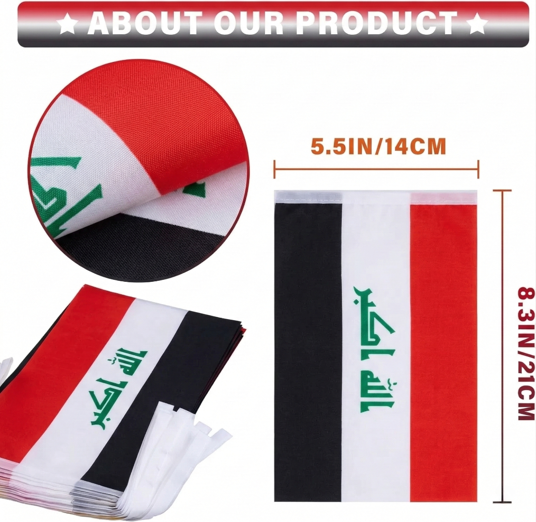 The Iraq flag design creates a clear display for classrooms, offices, porches, balconies, gardens, and sports venues. Stitched edges and clean finishing details help maintain the shape of each flag during use.