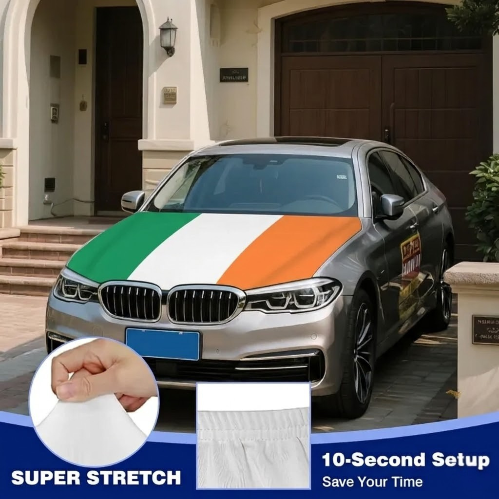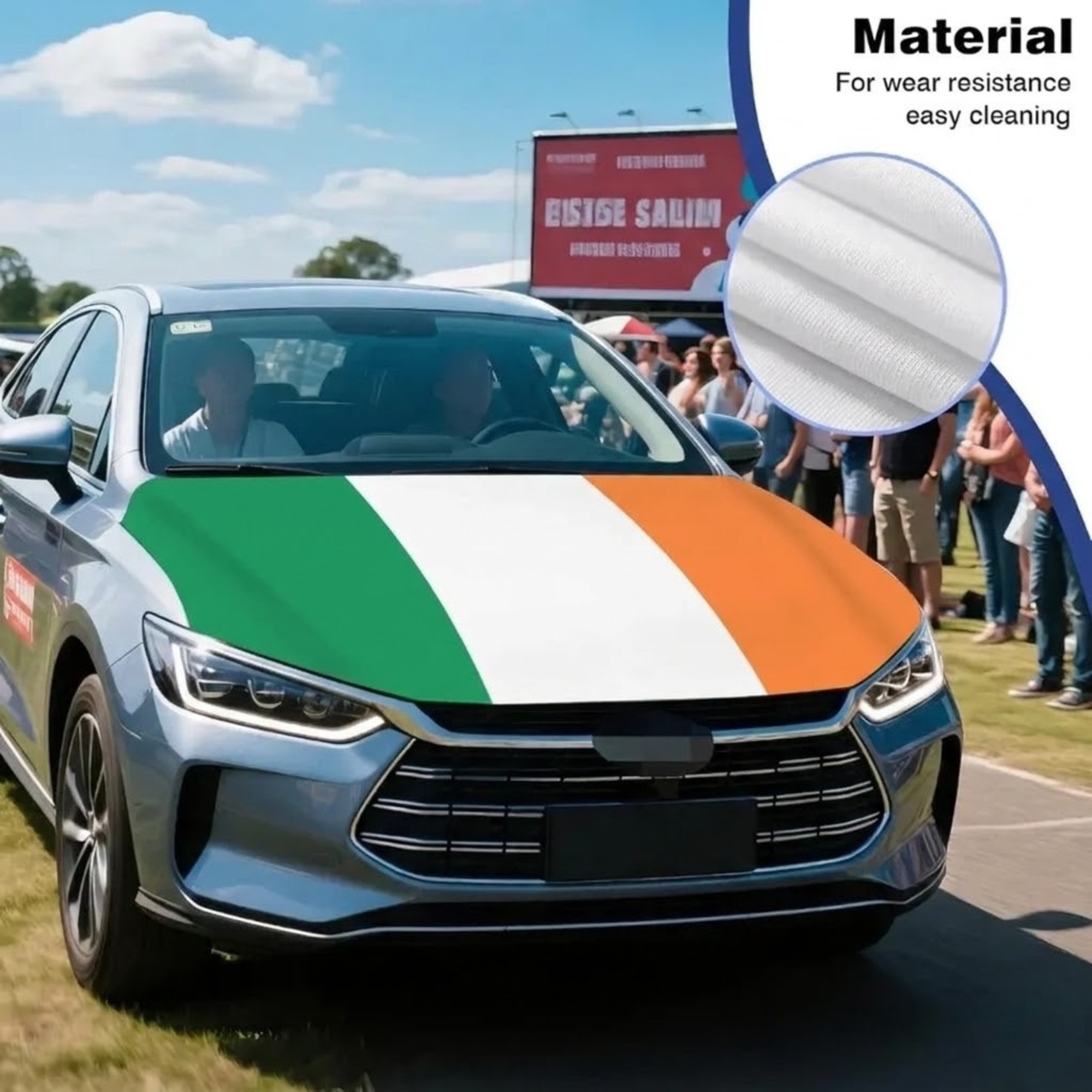 Constructed from stretch polyester fabric, the material adapts to the shape of the hood area and helps maintain a smooth and fitted appearance during normal driving. The flexible fabric allows quick placement over the hood while remaining positioned during regular road use. This cover is suitable for use during tournaments, national celebrations, parades, and themed gatherings. The material is also made to handle common outdoor conditions such as sunlight, wind, and light rain, allowing the cover to be used for outdoor vehicle decoration.