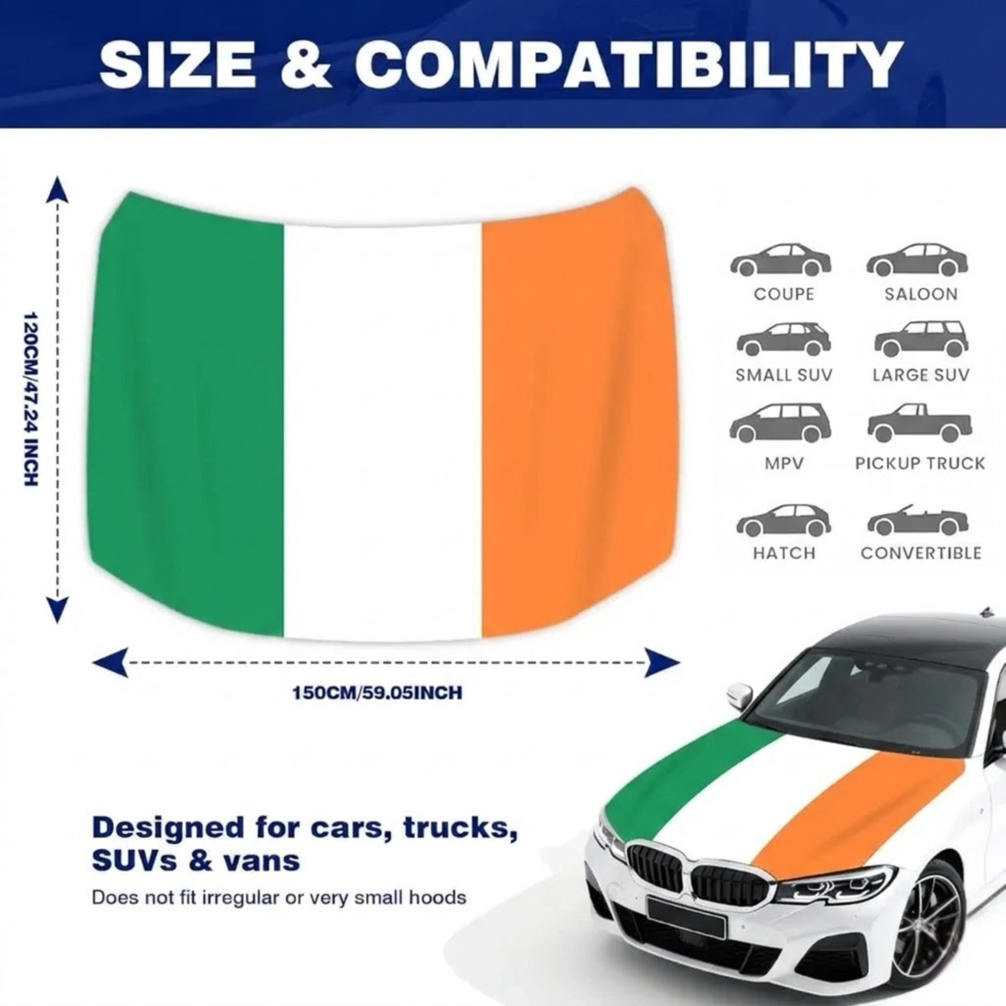 This Official FIFA 2026 Ireland Flag Car Hood Cover is created to display national pride while adding practical coverage to the front hood of a vehicle. With an approximate size of 4 x 5 feet, the cover offers a universal fit that works with most cars, trucks, and SUVs. The design features the green, white, and orange tricolor of the Ireland flag printed across the surface for a clear patriotic presentation during sporting events and celebrations.