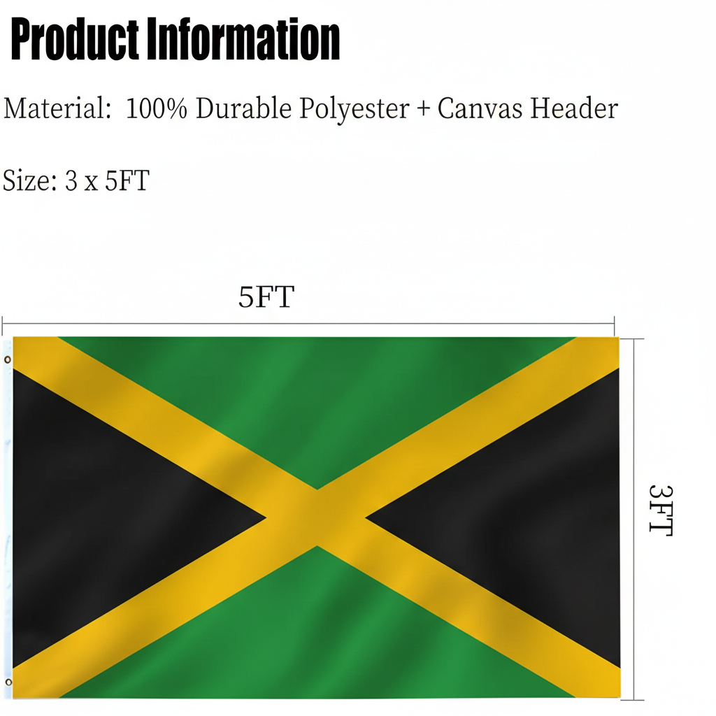 This 3 x 5 outdoor Official FIFA 2026 Jamaica Flag is created for display in many different environments, presenting a strong representation of national pride. The flag is produced using three layer 200D polyester fabric, and the double sided structure allows the black, green, and gold Jamaican flag design to appear clearly on both sides instead of showing a mirrored reverse image. A reinforced canvas style header provides added support and allows simple hanging, making the flag suitable for gardens, patios, marine areas, public venues, and interior decorative settings. Fade resistant printing helps preserve the distinctive colors and design during extended periods of display, while reinforced edge stitching helps maintain the structure when used outdoors. The lightweight fabric moves smoothly even in gentle wind conditions, creating a balanced presentation during football tournaments, cultural gatherings, or everyday decorative use. This overview highlights important product information to assist customers when reviewing specifications before selecting the item.