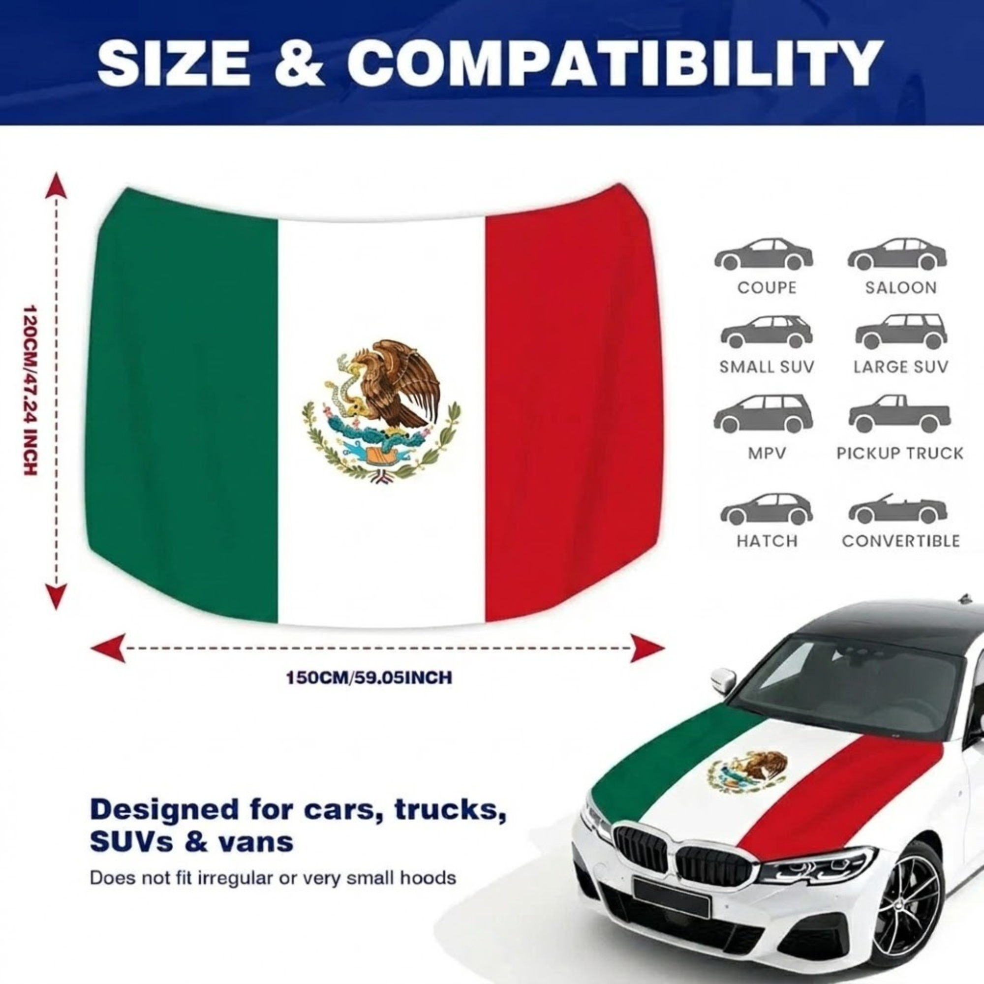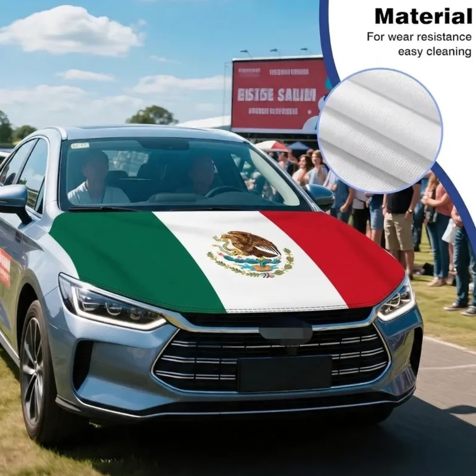 Show your support during the global football celebration with the Official FIFA 2026 Mexico Flag Car Hood Cover. Designed with the iconic green, white, and red layout and the detailed national emblem at the center, this cover transforms the front of your vehicle into a bold display of national pride. The vibrant design stands out during match days, fan gatherings, parades, and tournament celebrations. Made from lightweight fabric, it spreads smoothly across the hood and creates a striking visual when your vehicle is parked or on the move. The flexible material allows easy placement and removal, making it convenient for special events and sporting occasions. Clean edges and clear printing help maintain a sharp appearance throughout use. Suitable for many vehicle types, this accessory brings festive energy to football celebrations while proudly representing Mexico.