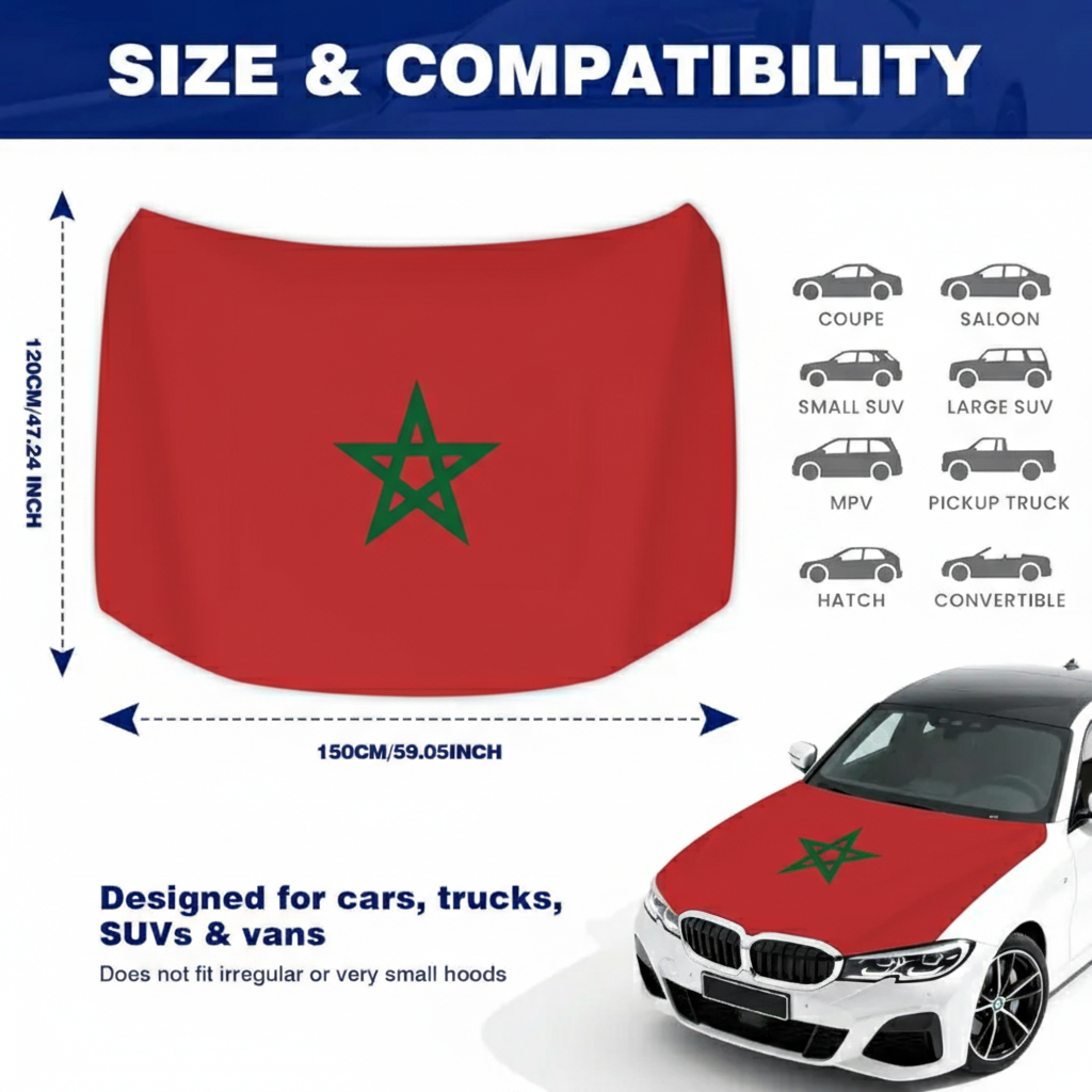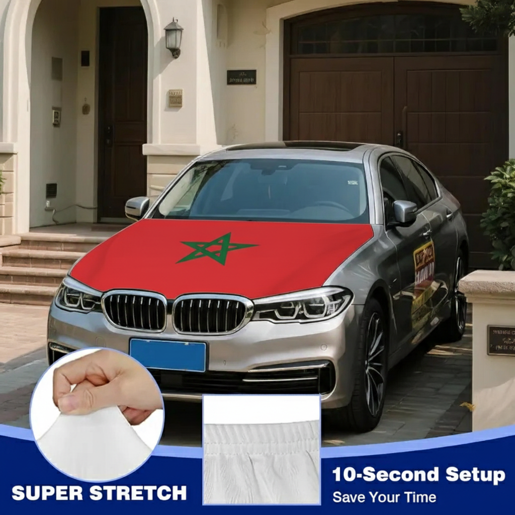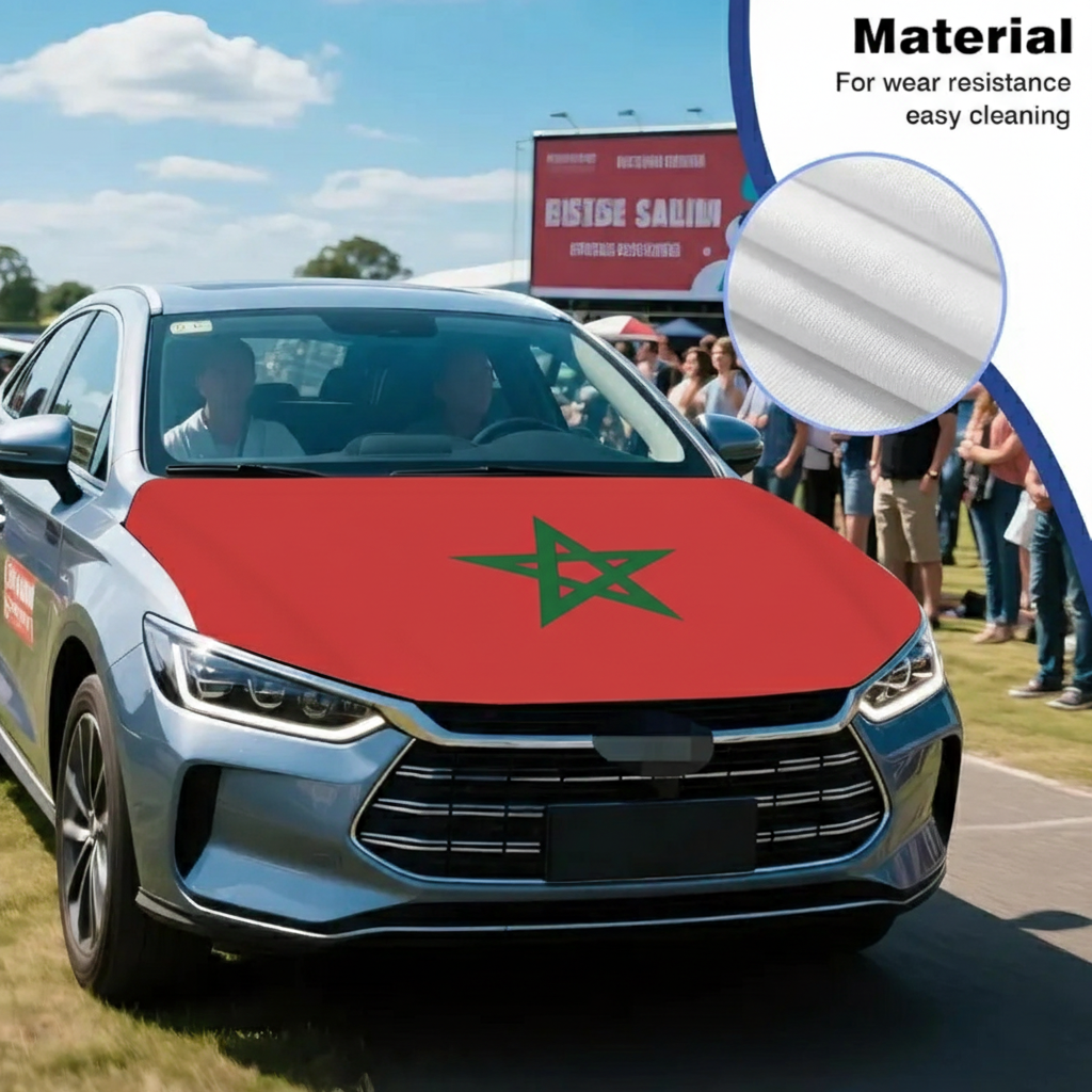 Constructed from stretch polyester fabric, the material fits closely over the hood area and maintains a smooth appearance during normal driving conditions. The Moroccan flag design creates a clear national display suitable for parades, sporting events, cultural gatherings, and everyday vehicle decoration.