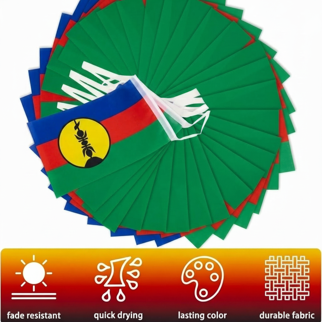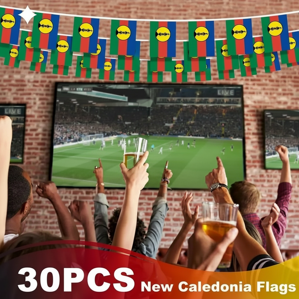 The Official FIFA 2026 New Caledonia Flag Banner is created to add a festive and patriotic atmosphere to schools, sports tournaments, parties, and national celebration events. The full banner extends to approximately 33 feet and contains 30 small New Caledonia flags evenly arranged along the string. Each individual flag measures about 5.5 x 8.2 inches and displays the traditional colors and emblem associated with the New Caledonia flag, representing the cultural and regional identity of the territory.