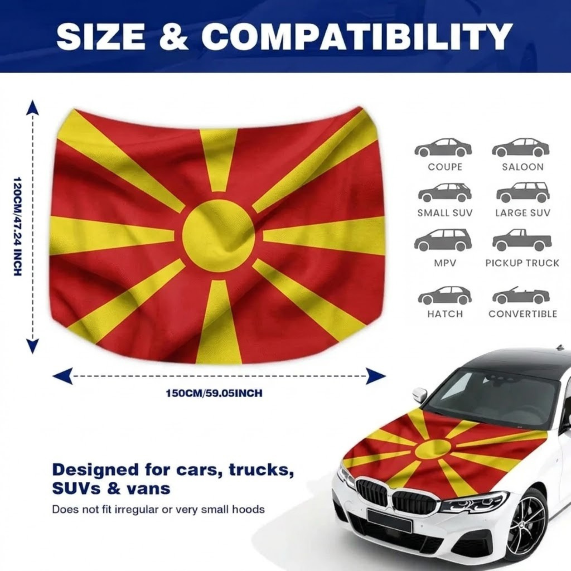 This Official FIFA 2026 North Macedonia Flag Car Hood Cover is created to display national pride while providing practical coverage for the front hood area of a vehicle. Measuring approximately 4 x 5 feet, the cover offers a universal size that fits most cars, SUVs, and trucks. The design features the distinctive North Macedonia flag with its central sun and radiating rays, presenting a strong patriotic appearance during tournaments, parades, and national celebrations. Made from stretch polyester fabric, the material conforms smoothly to the hood surface and maintains a neat look during regular driving. The flexible fabric allows convenient placement and removal without complicated installation steps. Its construction supports everyday use and helps maintain a clean presentation for both special occasions and daily driving. This hood cover combines visual appeal and practical design for drivers who want to highlight national support during sporting events and cultural gatherings.