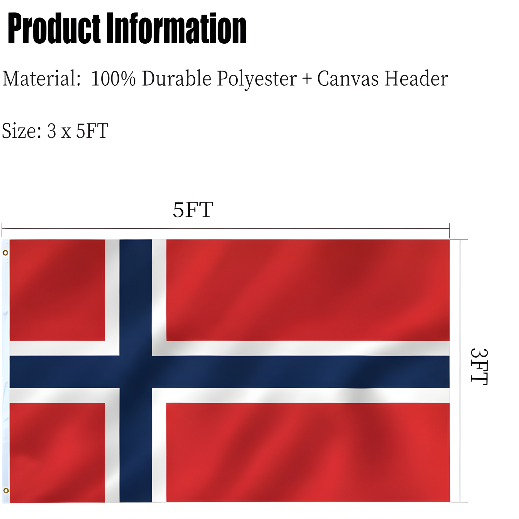 This 3x5 outdoor Official FIFA 2026 Norway Flag is designed for display across a wide range of environments, presenting a strong symbol of national pride. Manufactured using three layer 200D polyester fabric, the double sided construction allows the Norwegian cross with the red, white, and blue colors to appear properly on both sides instead of displaying a mirrored reverse image. A reinforced canvas style header improves overall support and allows convenient hanging, making the flag suitable for gardens, patios, marine locations, public venues, and interior decoration. Fade resistant printing helps preserve the bold background colors and cross design during extended use, while reinforced edge stitching assists in maintaining the flag during outdoor display. The lightweight material moves smoothly even with mild wind, creating a balanced presentation during football tournaments, cultural gatherings, or everyday decoration. This overview outlines important product details to help customers review the specifications before selecting the item.