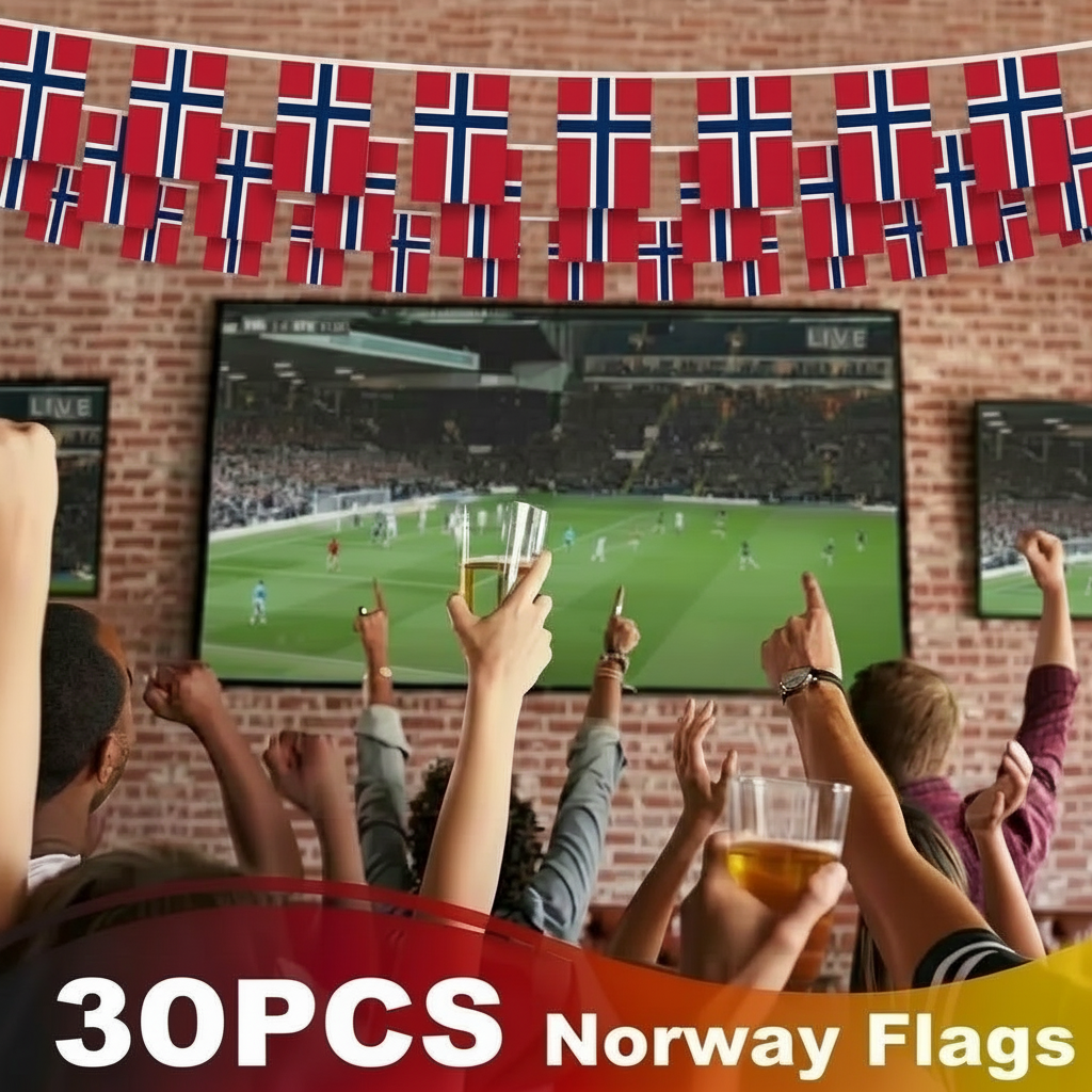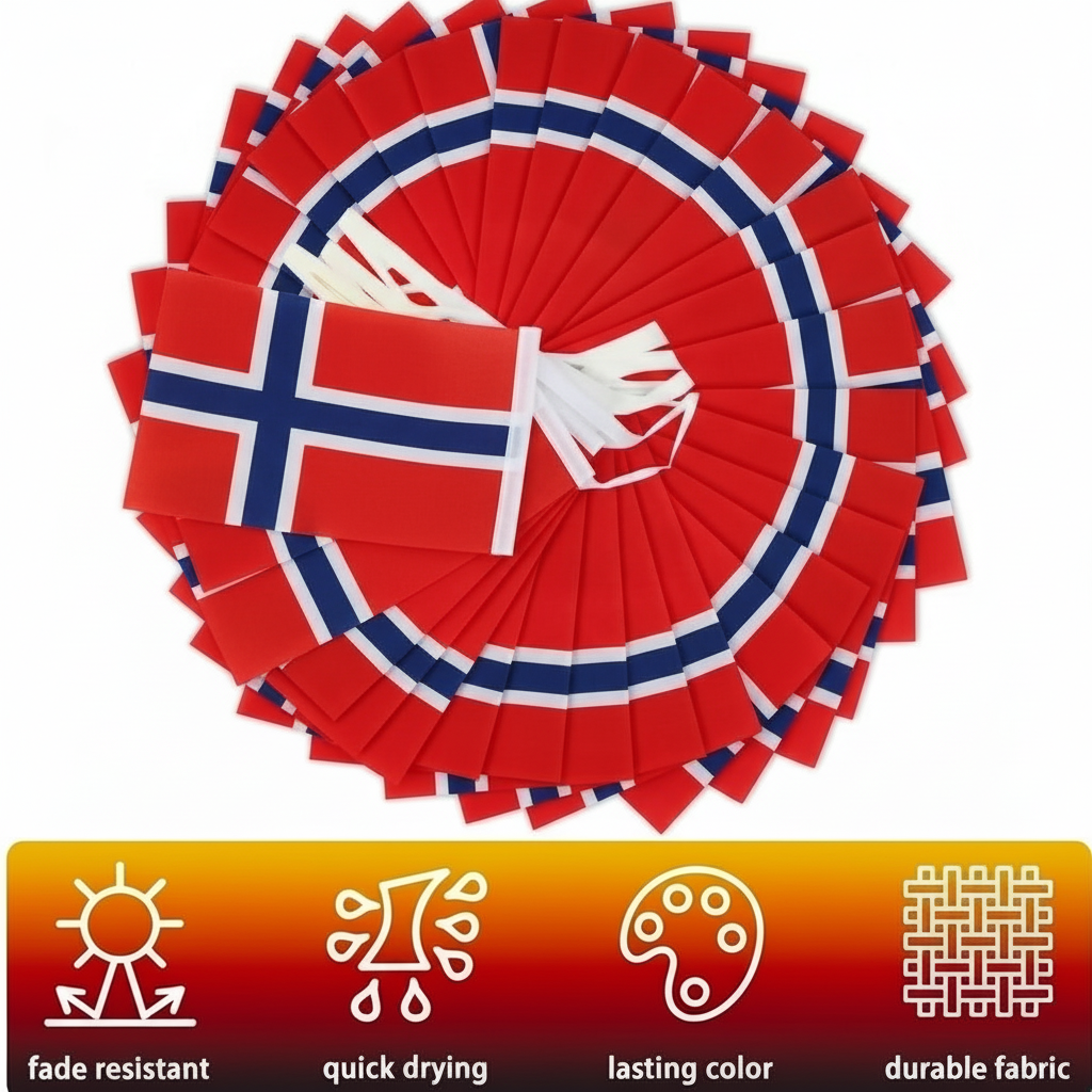 This Official FIFA 2026 Norway Flag Banner is designed to create a festive and patriotic setting for schools, parties, sports tournaments, and national celebrations. The banner extends approximately 33 feet in total length and includes 30 small Norwegian flags evenly placed along the string. Each flag measures around 5.5 x 8.2 inches and displays the traditional red background with the blue Nordic cross outlined in white, representing the national identity of Norway.