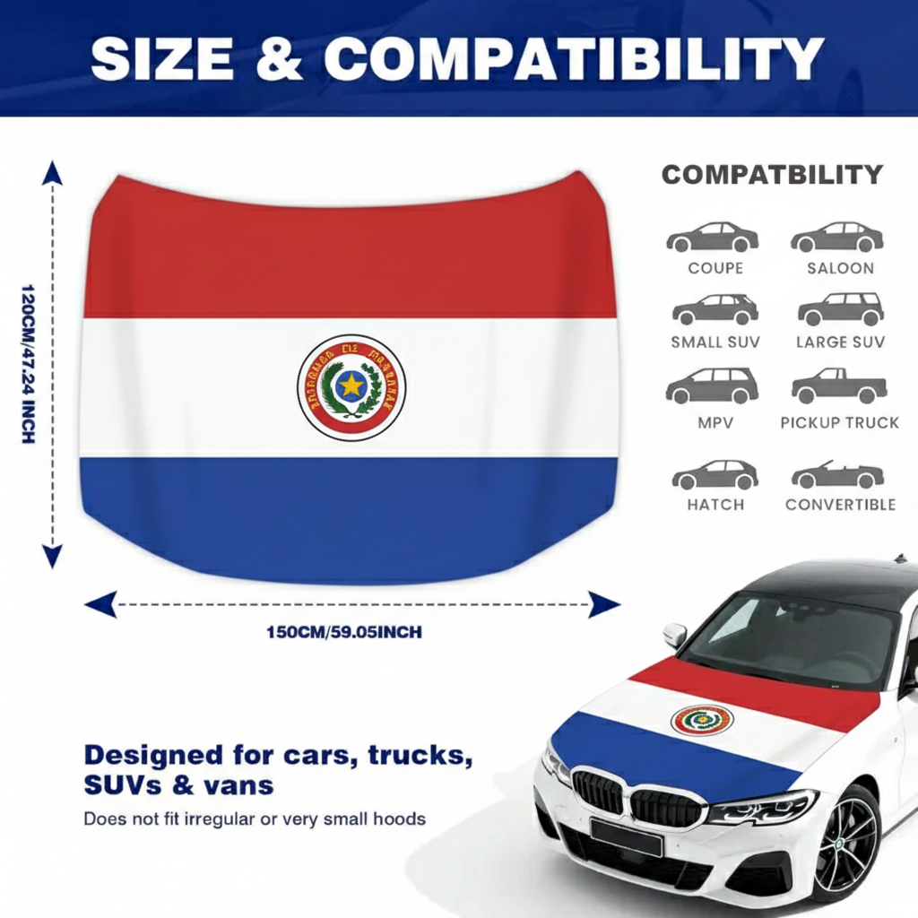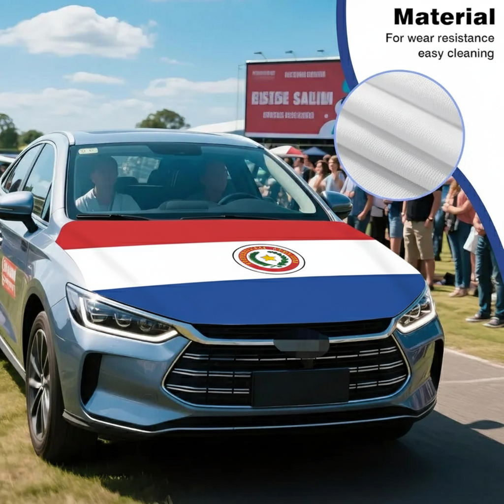 The Paraguay flag design adds a distinctive national theme, making the cover suitable for sports tournaments, parades, public gatherings, and festive occasions. The flexible fabric construction supports easy placement over the hood area and allows quick removal when needed. Built for outdoor conditions, the material is designed to handle sun exposure, wind, and light rain while maintaining its printed appearance. This hood cover provides a practical decorative option for drivers who want to display national pride during FIFA 2026 events and other celebrations.