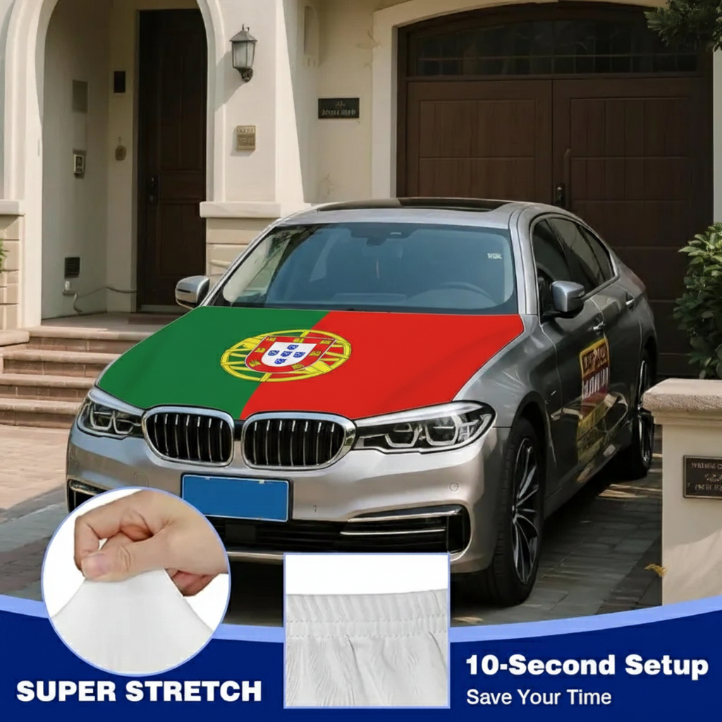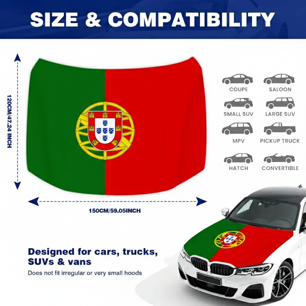 This Official FIFA 2026 Portugal Flag Car Hood Cover is created to give vehicles a patriotic appearance while covering the hood surface during everyday driving or special occasions. Measuring approximately 4 x 5 feet, the size supports compatibility with many standard cars, trucks, and SUVs. The cover is made using stretch polyester fabric that spreads evenly across the hood area, helping create a smooth and balanced look once installed.