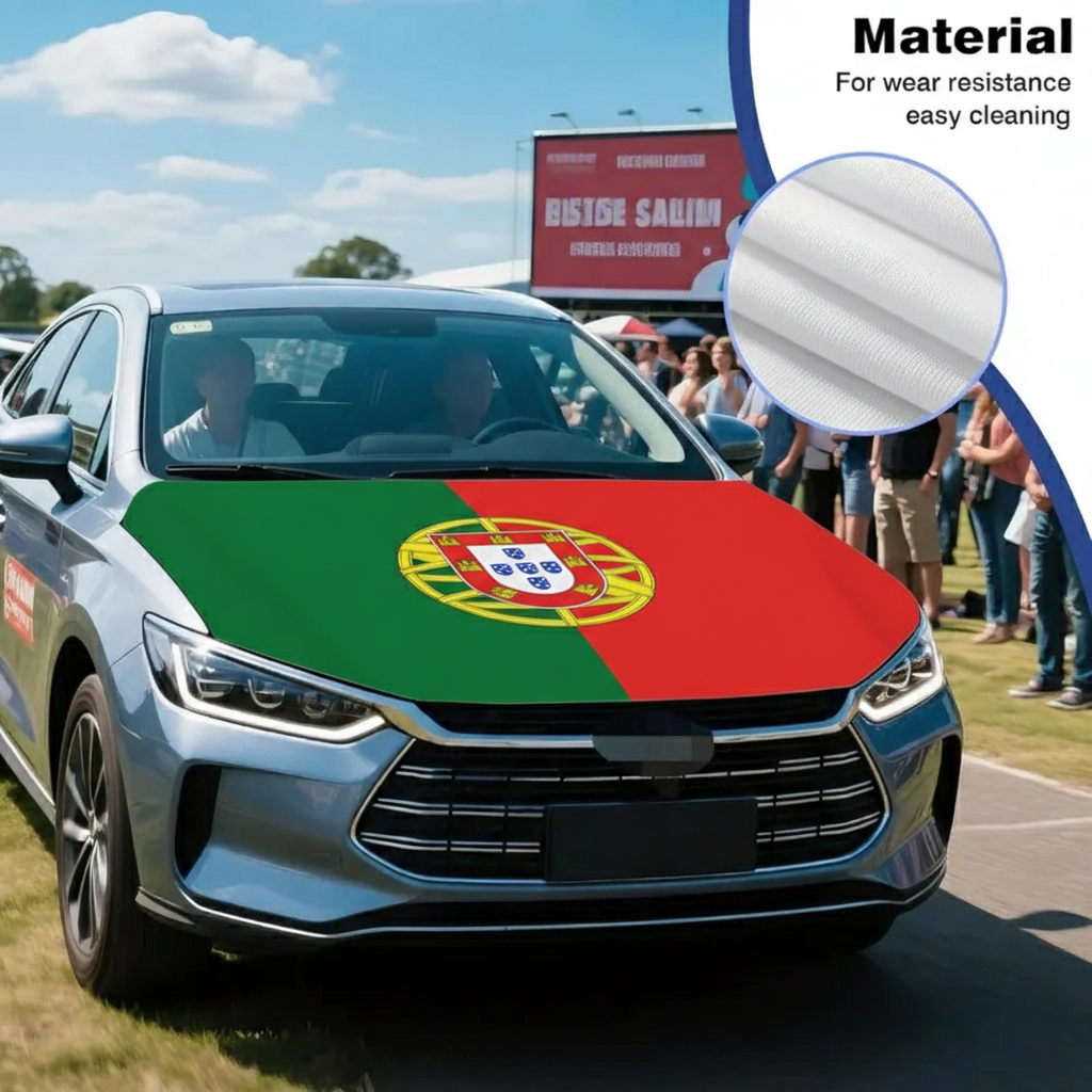 The printed Portugal national flag design displays the recognizable green and red colors along with the central national emblem, allowing vehicles to show national pride during football tournaments, international matches, parades, celebrations, and decorative use. The flexible fabric allows quick placement and removal whenever needed, making it suitable for temporary event decoration or seasonal display during sports competitions.