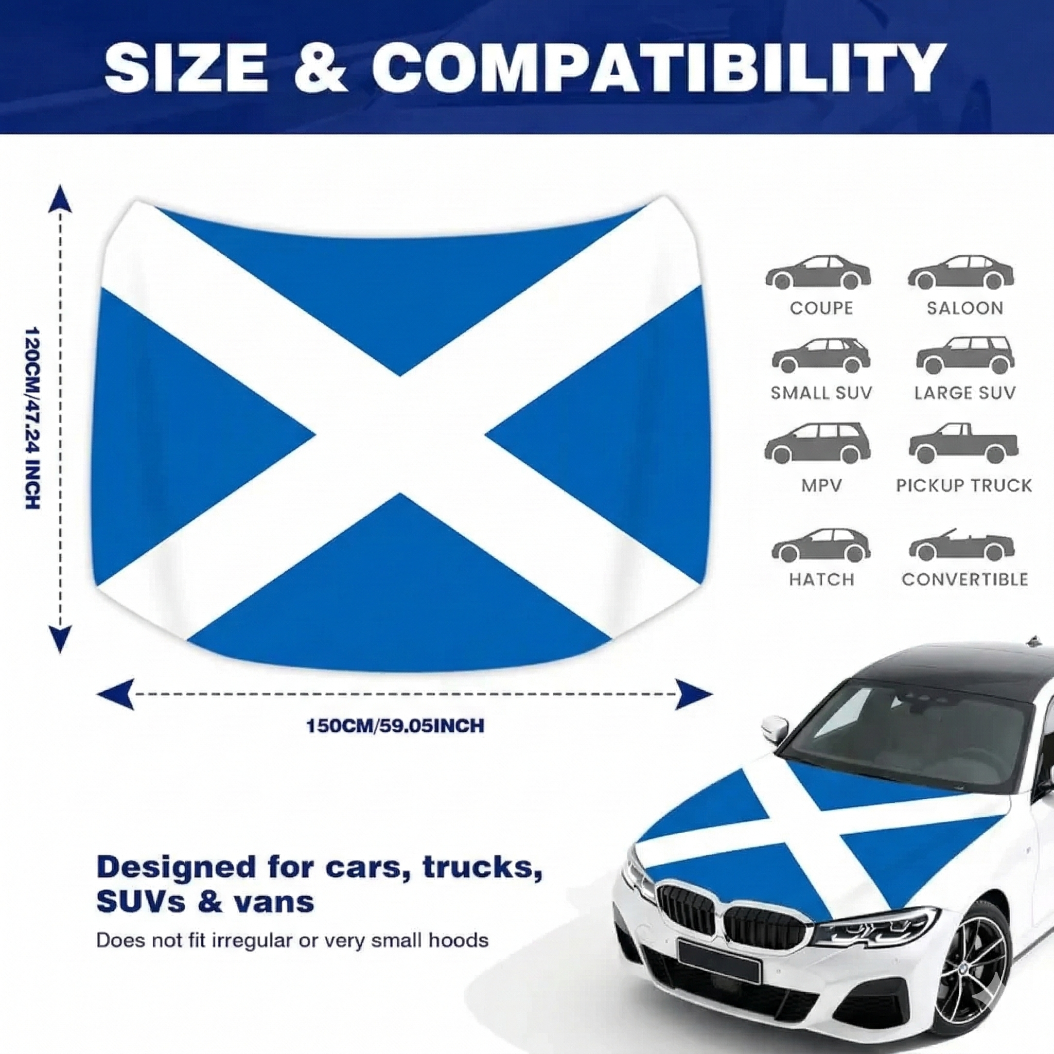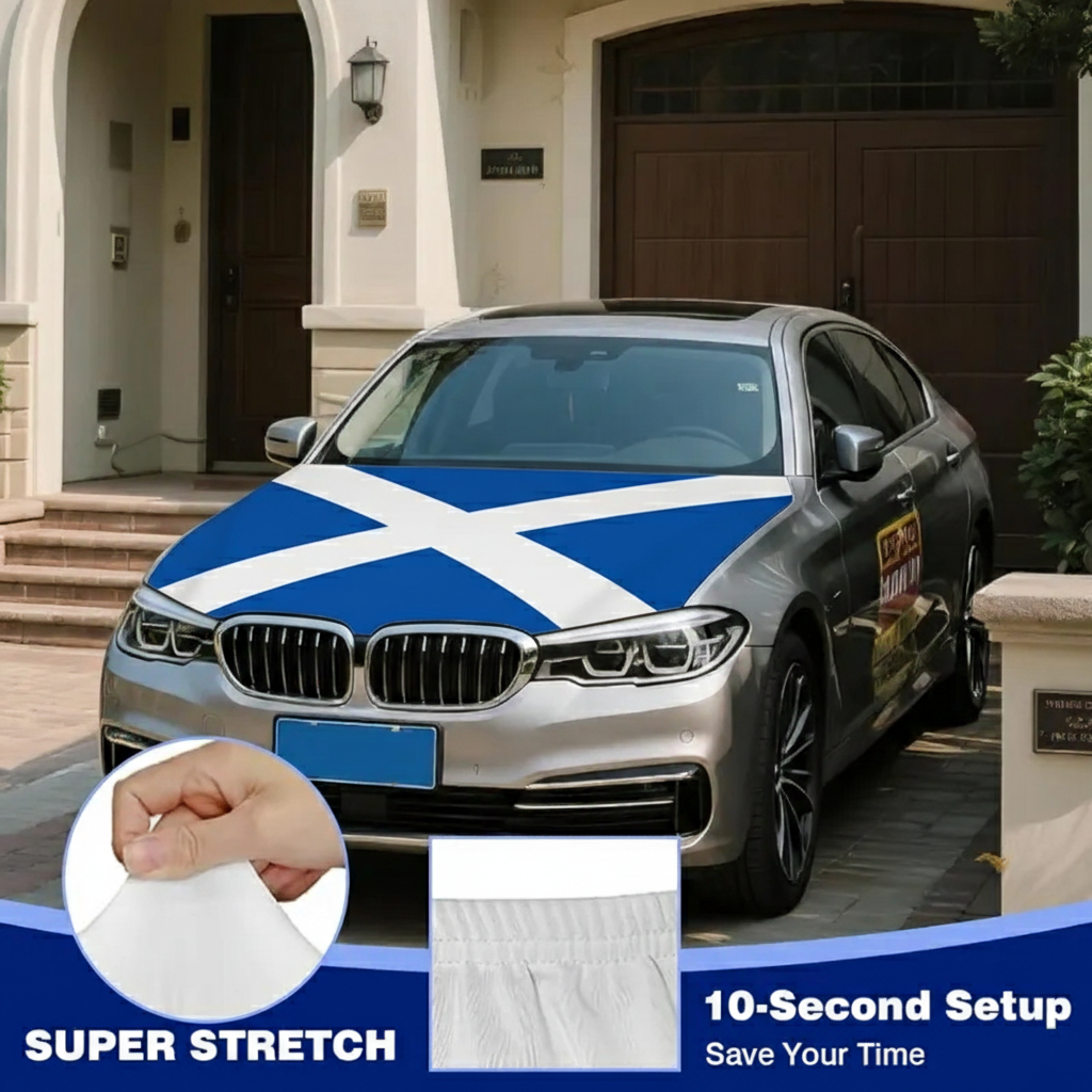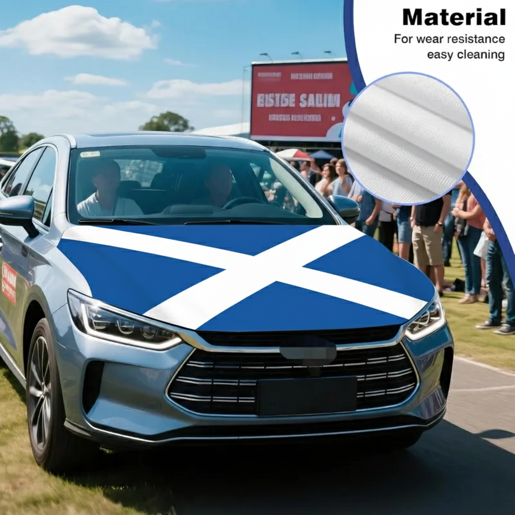 Made from stretch polyester fabric, the material fits closely across the hood area and maintains a smooth appearance during normal driving conditions. The Scotland flag design creates a clear national display suitable for parades, sporting events, cultural gatherings, and everyday vehicle decoration.