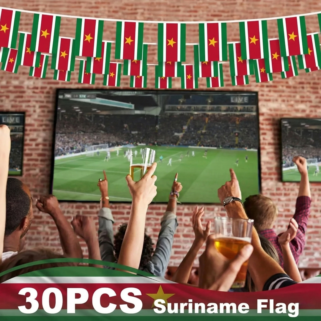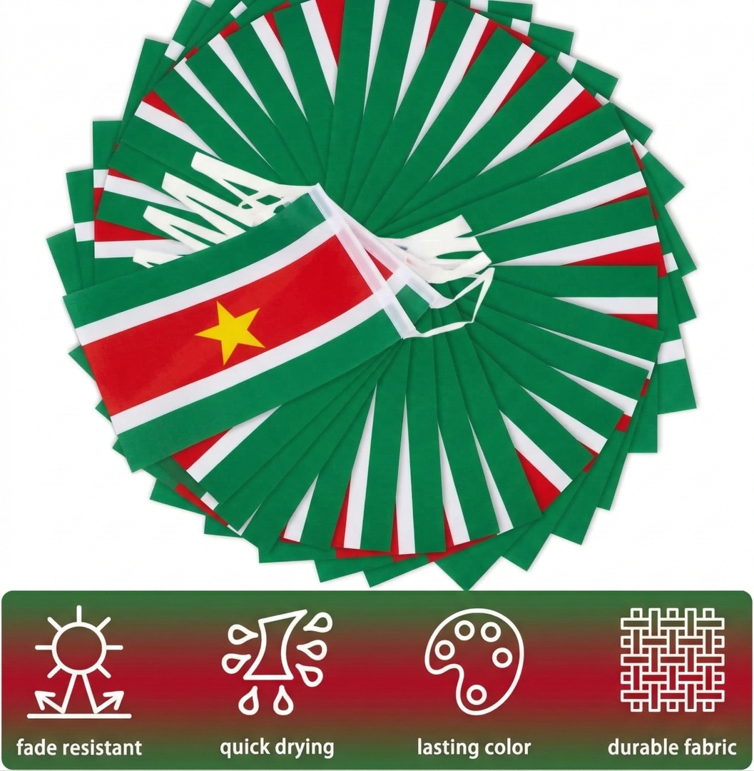 The Official FIFA 2026 Suriname Flag Banner is designed for decorative display in schools, gatherings, sporting events, and national celebrations. The banner measures approximately 33 feet in total length and includes 30 small Suriname flags, each sized about 5.5 × 8.2 inches.