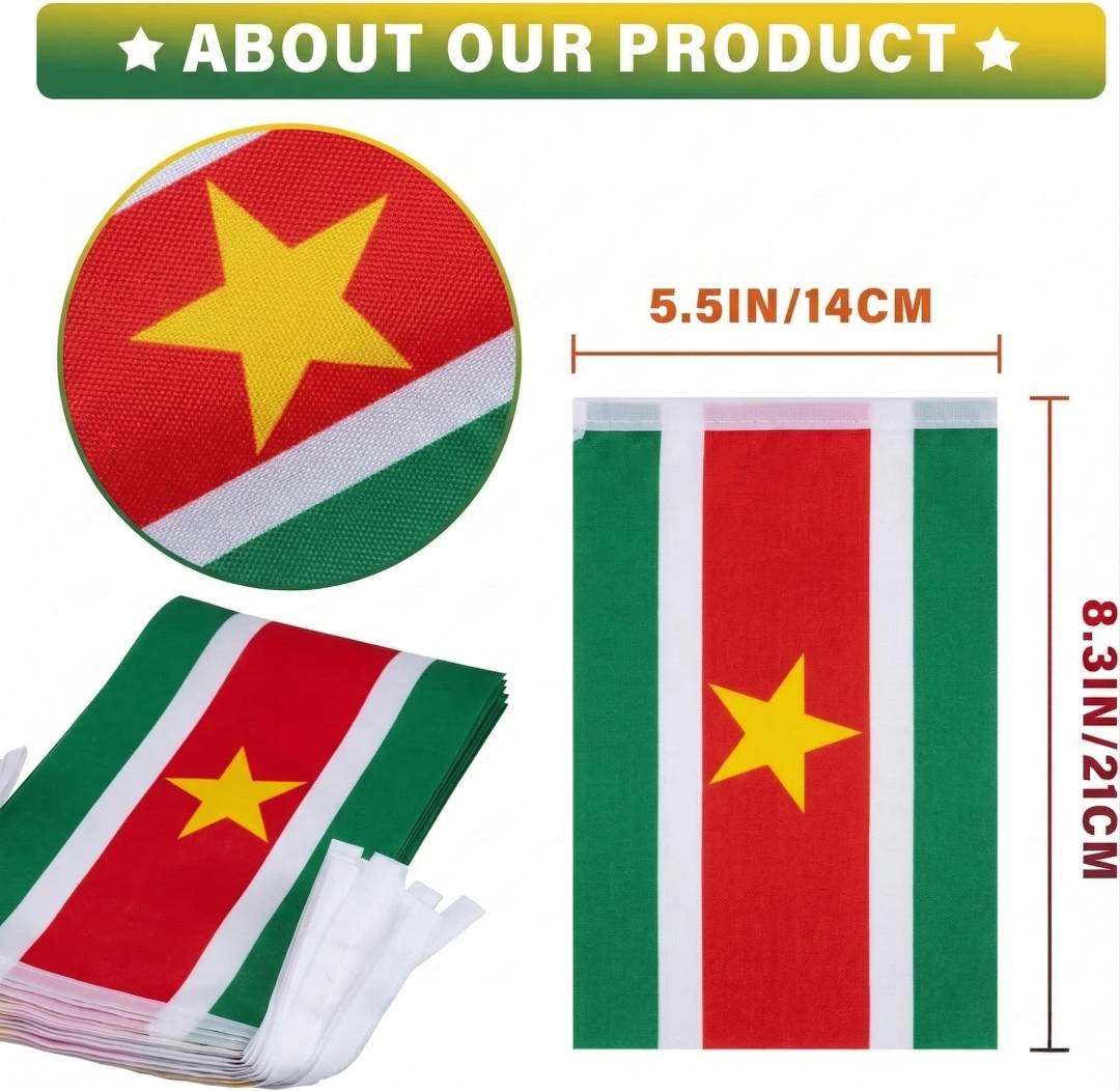 The Suriname flag design creates a clear display for classrooms, offices, porches, balconies, gardens, and sports venues. Stitched edges and clean finishing details help maintain the shape of each flag during use.