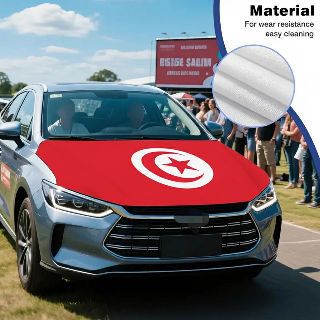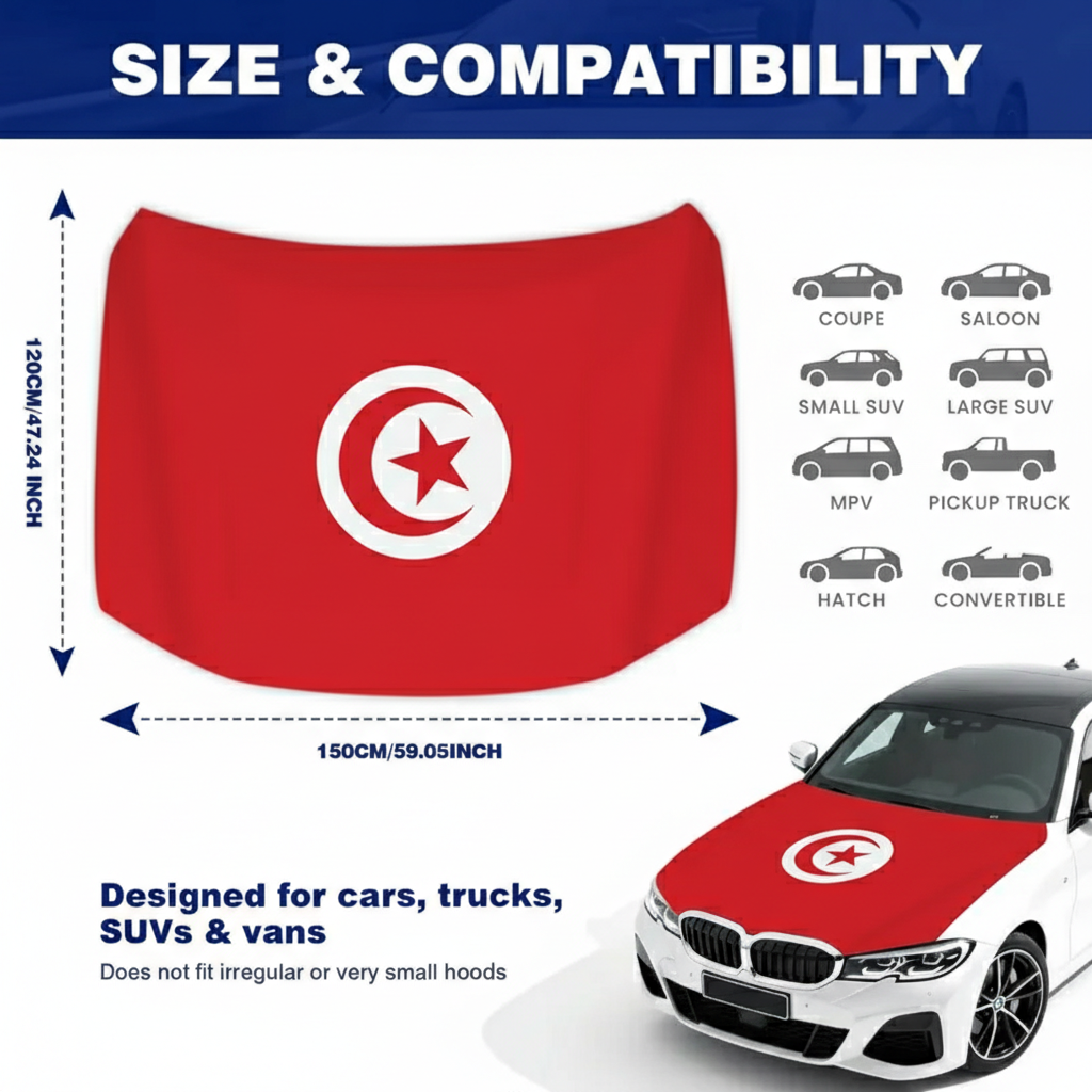 This Official FIFA 2026 Tunisia Flag Car Hood Cover is designed to add a bold national look while offering practical surface coverage for everyday driving. Measuring approximately 4 x 5 feet, it provides a universal fit suitable for most cars, trucks, and SUVs. Crafted from stretchable polyester fabric, the material fits smoothly over the hood area and maintains a neat appearance during regular use. The red and white design with crescent and star creates a noticeable display, making it suitable for sporting events, national celebrations, parades, and daily decoration.