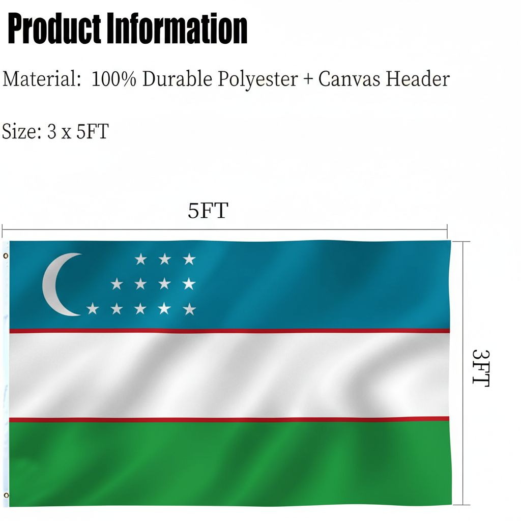This 3x5 outdoor Official FIFA 2026 Uzbekistan Flag is created for display across a variety of environments, representing a strong expression of national identity. Produced with three layer 200D polyester fabric, the double sided structure allows the blue, white, and green stripes with the crescent moon and stars to appear correctly on both sides instead of showing a mirrored reverse image. A reinforced canvas style header improves overall support and allows convenient hanging, making the flag suitable for gardens, patios, marine locations, public areas, and interior decoration. Fade resistant printing assists in preserving the distinctive colors and emblem during extended display periods, while reinforced edge stitching helps maintain the overall structure when used outdoors. The lightweight fabric moves smoothly even in light wind conditions, creating a balanced presentation during football tournaments, cultural gatherings, or everyday decorative use. This overview outlines the main product details to help customers review specifications before selecting the item.