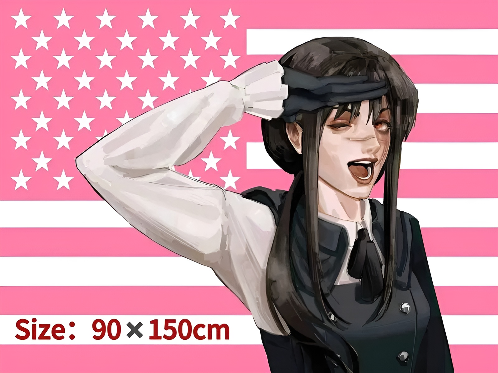 - Design: Anime character artwork with pink USA flag backdrop